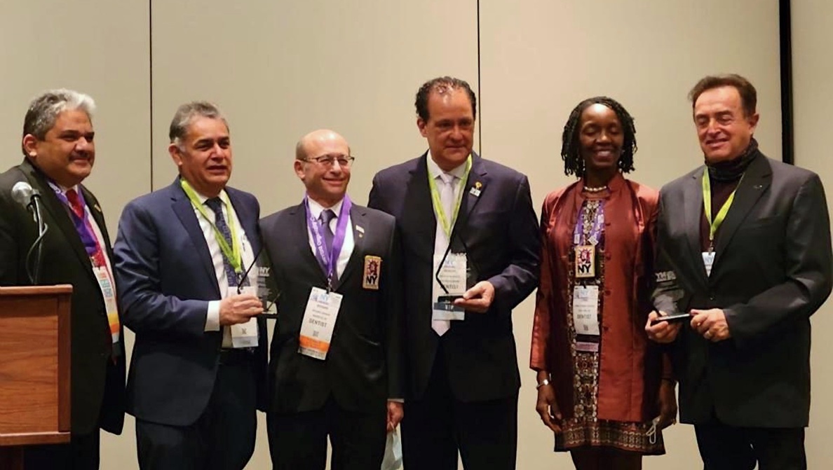 Tres odontólogos latinoamericanos fueron homenajeados en el Greater New York Dental Meeting: el Dr. Irubiel Barbosa (segundo por la izquierda), el Dr. Moacyr Menéndez (cuarto por la izquierda) y el Dr. Francisco Ramos-Gómez, a la derecha. Los directivos del GNYDM hicieron entrega de las placas conmemorativas del reconocimiento a su labor.