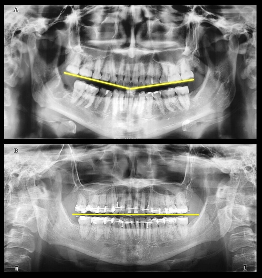 Figura 3. A) Imagen panorámica inicial de la inclinación del plano oclusal. B) Panorámica final que muestra la rectificación del plano oclusal.
