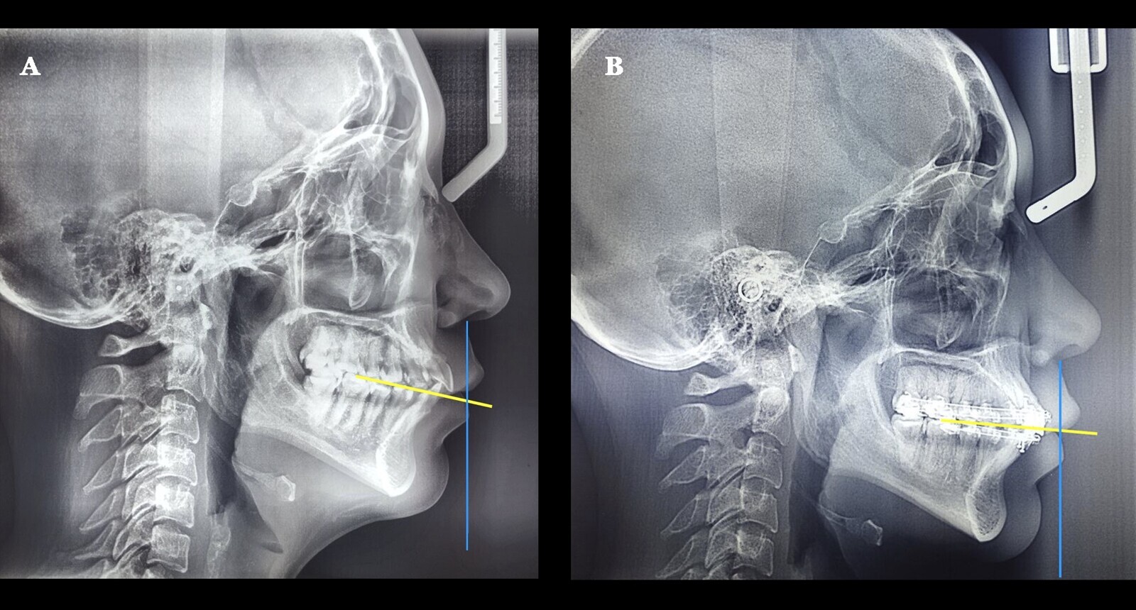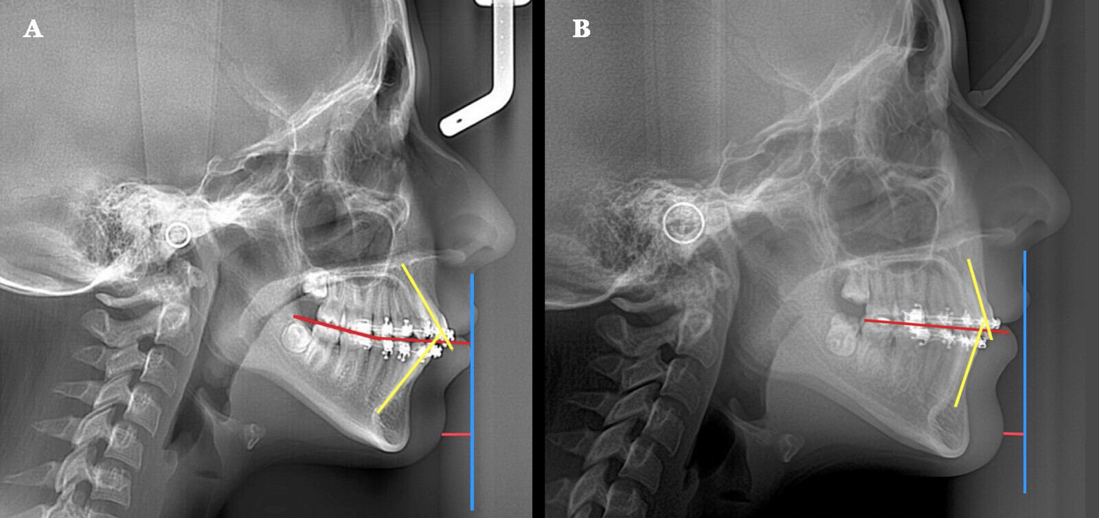 Figura 4. A) Telerradiografía de perfil inicial que muestra el plano oclusal inclinado. B) Telerradiografía de perfil final de la mejoría del plano oclusal, habiendo rotado en sentido antihorario.