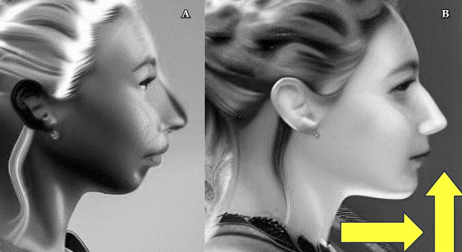 Figura 2. A) Imagen con perfil muy convexo y B) perfil recto obtenido por rotación antihoraria mandibular (Imagen generada por IA – Runaway).