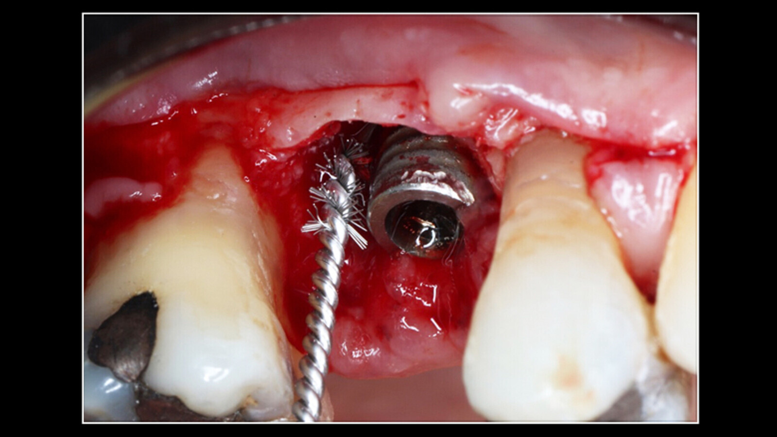 Figura 3. Curetaje de todo el tejido granulomatoso alrededor del implante, aplicación de Perisolv en el defecto óseo periimplantar por 60 segundos, lavado con solución salina y descontaminación del implante con cepillo de titanio.