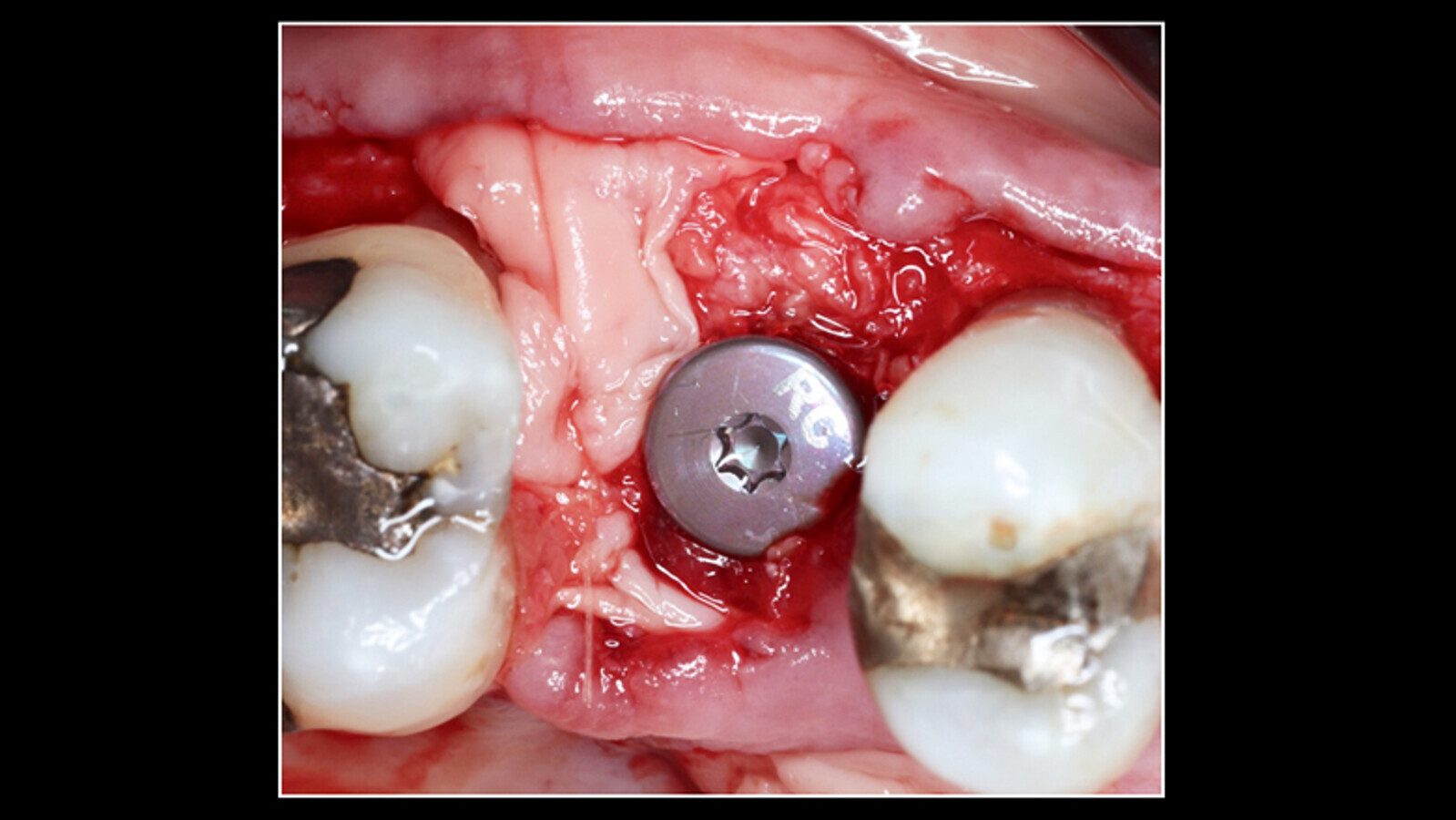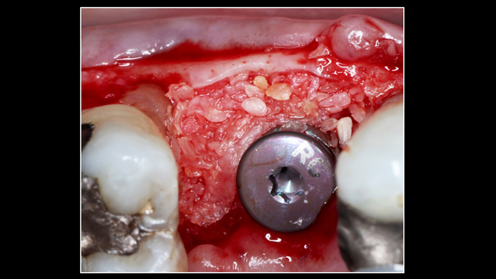 Figura 4. Injerto en el defecto óseo periimplantar e una mezcla del aloinjerto Mineroos, plasma rico en plaquetas y fibrina rica en plaquetas y leucocitos L-PRF.