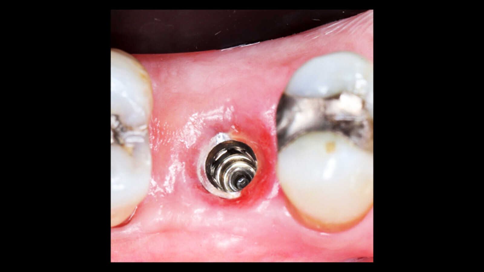 Al control postoperatorio a 30 días la paciente presenta una regeneración de todo el tejido mucoso periimplantar, sellado de tejido blando, color de mucosa normal y no hay de sangrado. No se realiza sondaje para no afectar la cicatrización (Figura 6).