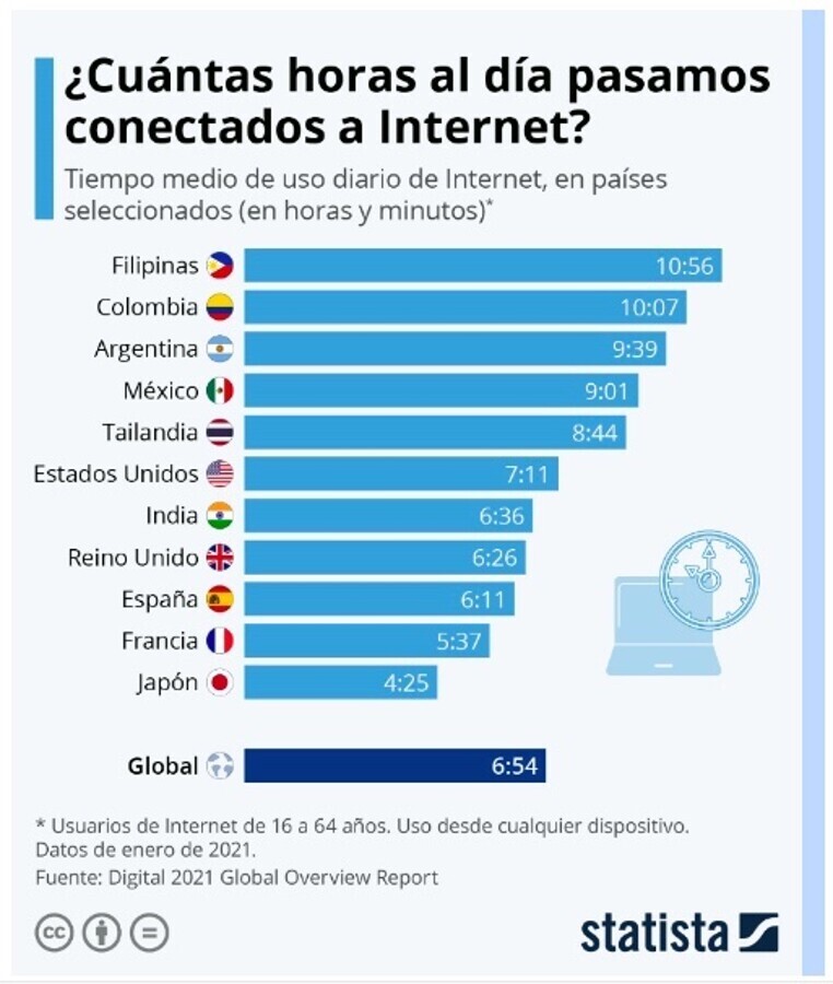 Por otra parte, Mónica Mena, en un artículo del 28 de enero del 2021, en es.estatista.com, concluyó: “6 horas y 54 minutos. Este es el tiempo medio global que pasaron los usuarios al día en Internet en 2020 (11 minutos más que el año anterior). Así se indica en un estudio que Hootsuite y We Are Social han llevado a cabo para el Digital 2021.