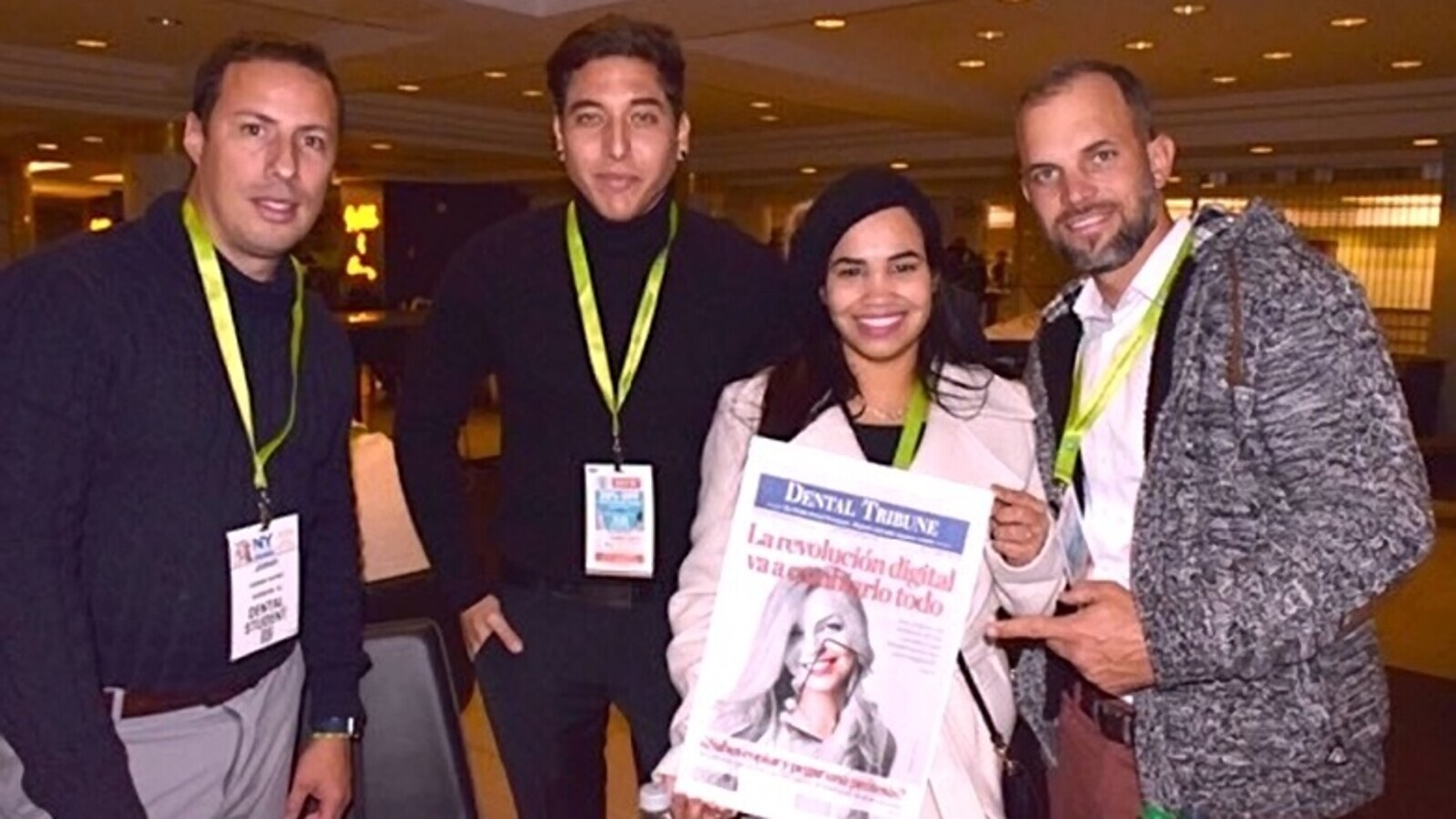 Tres estudiantes cubanos, invitados por GNYDM, en Nueva York con un ejemplar de Dental Tribune Latinoamérica: Josmar Suárez, Gabriel A. Villa Lopez, Irene Navarro del Sol y Darrien Alvarez Germadez. (Foto: José Antonio Rosario)