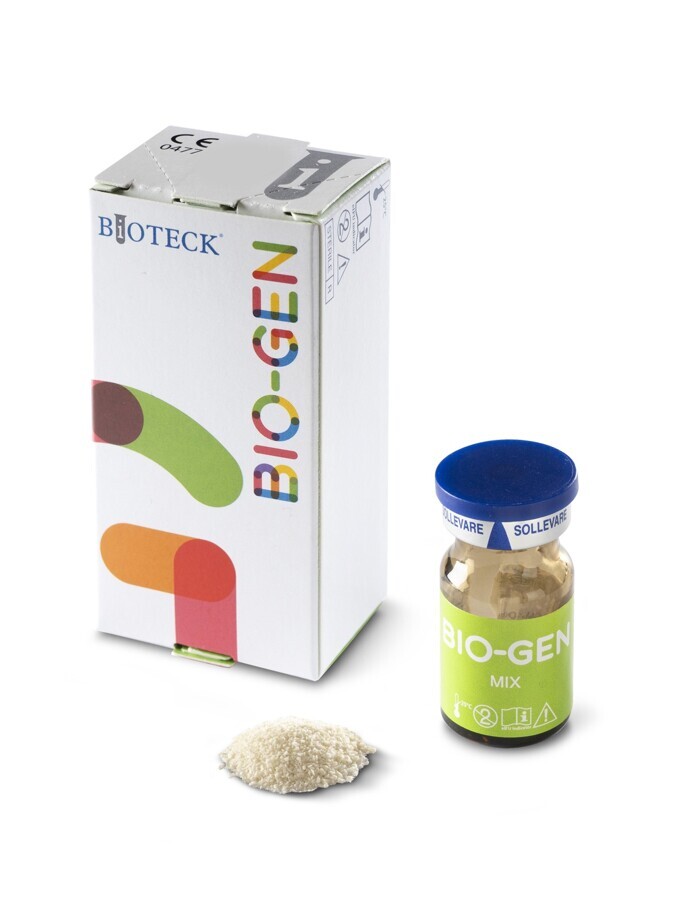 Bio-Gen está disponible en múltiples formatos, como gránulos esponjosos (tamaño 0,25–1 mm, 1–2 mm, 2–3 mm), gránulos cortico-cancellosos (tamaño 0,25–1 mm), gránulos corticales (tamaño 0,25–1 mm), gránulos en jeringa (tamaño 0,25–1 mm) y pasta ósea liofilizada (Bio-Gen Putty). Cada formato de Bio-Gen se puede utilizar en pequeños GBR, en defectos periodontales/periimplantarios y en la preservación del alveolo postextracción.