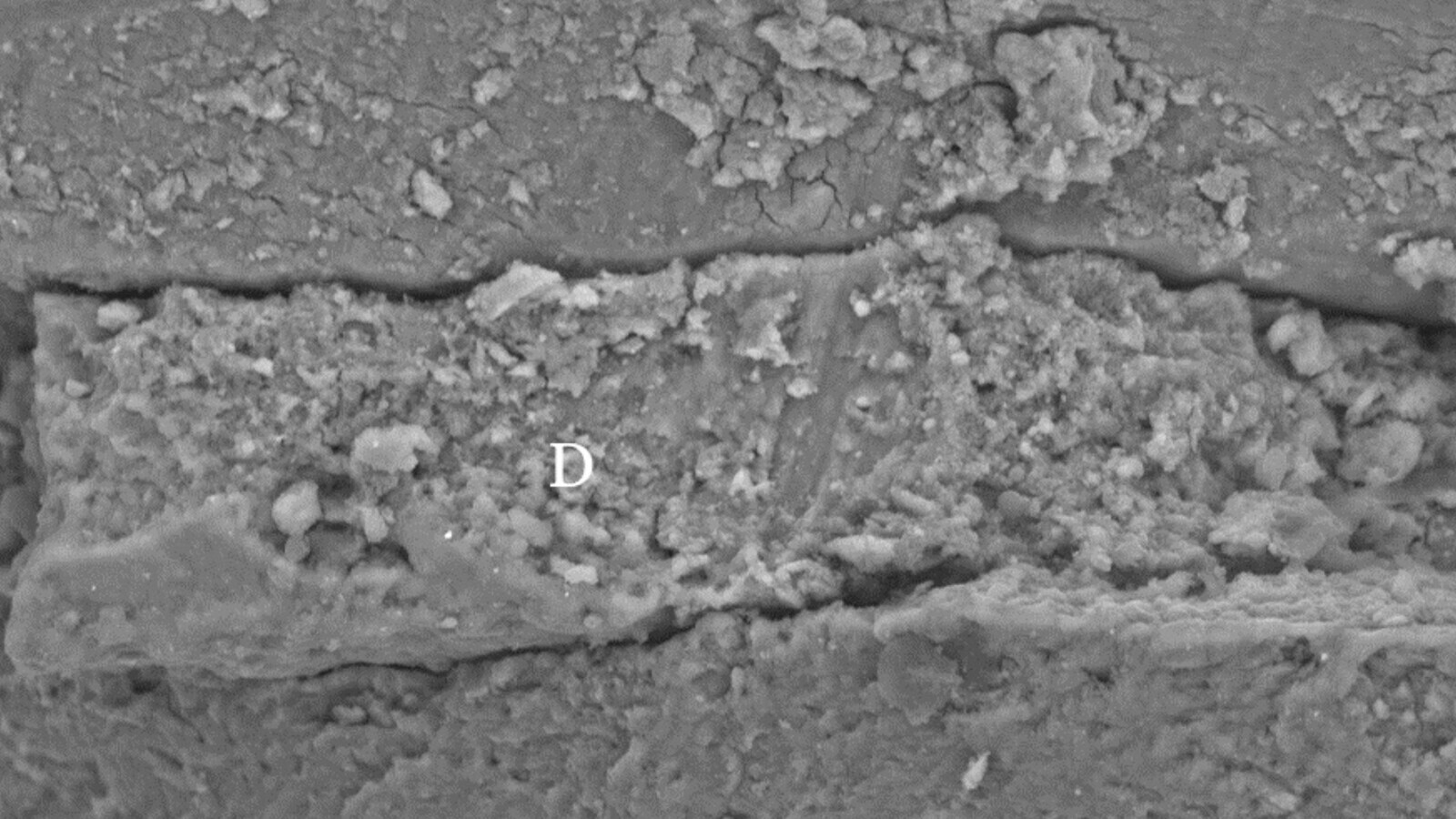 Figura 1. Conducto accesorio completamente obliterado con restos dentinales (D) de la preparación del conducto principal.