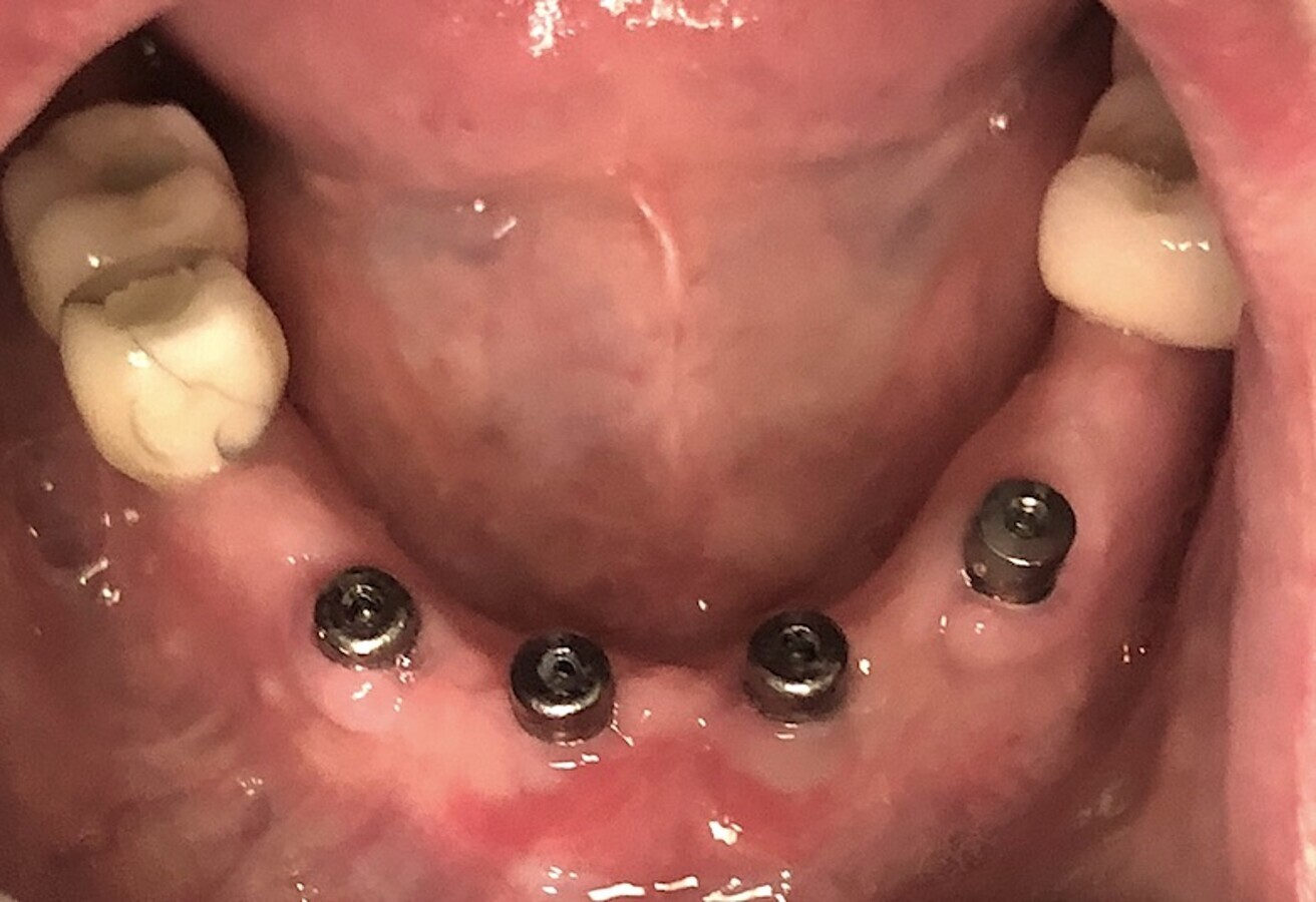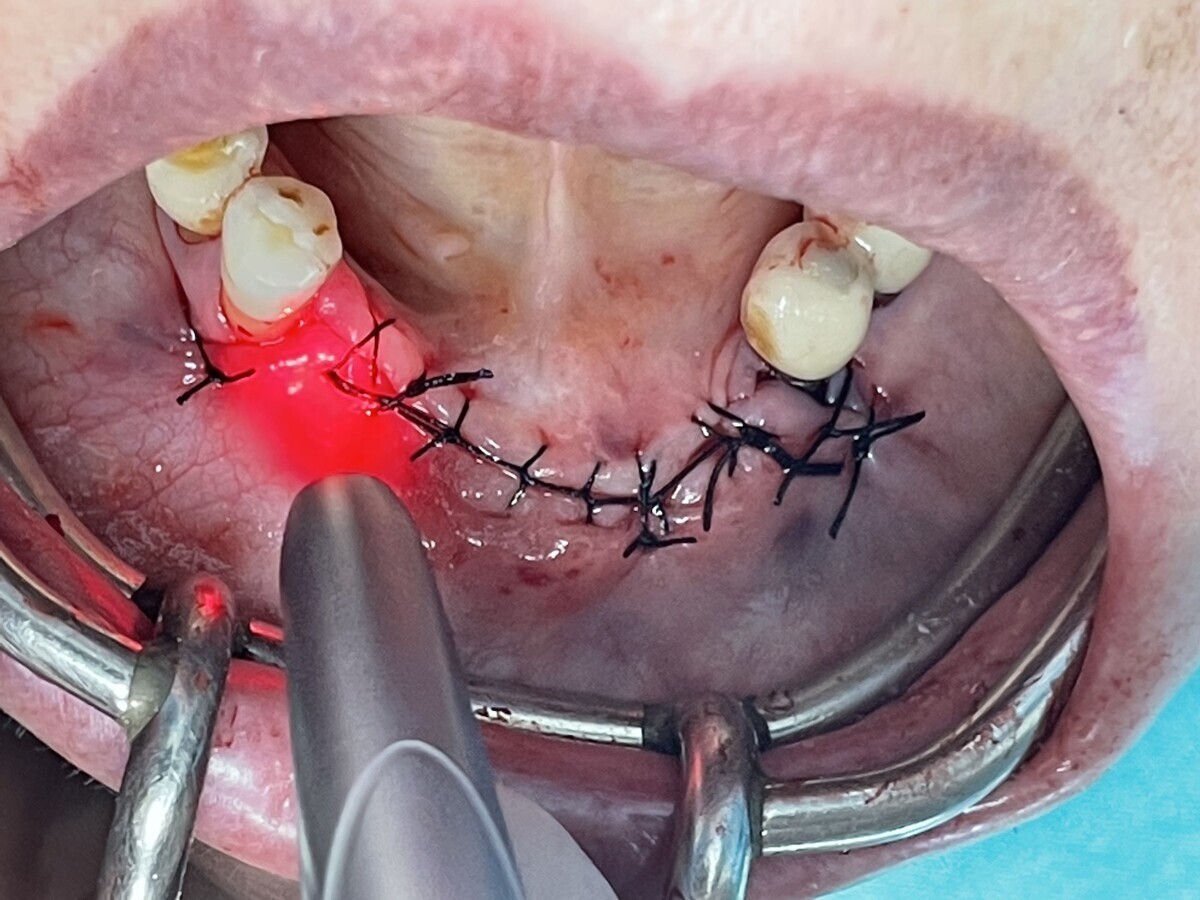 Figura 3. Tratamiento de Fotobiomodulación después de cirugía de implantes con láser de diodo 940 nm a 200 mW durante 180 segundos aplicado en varios puntos.