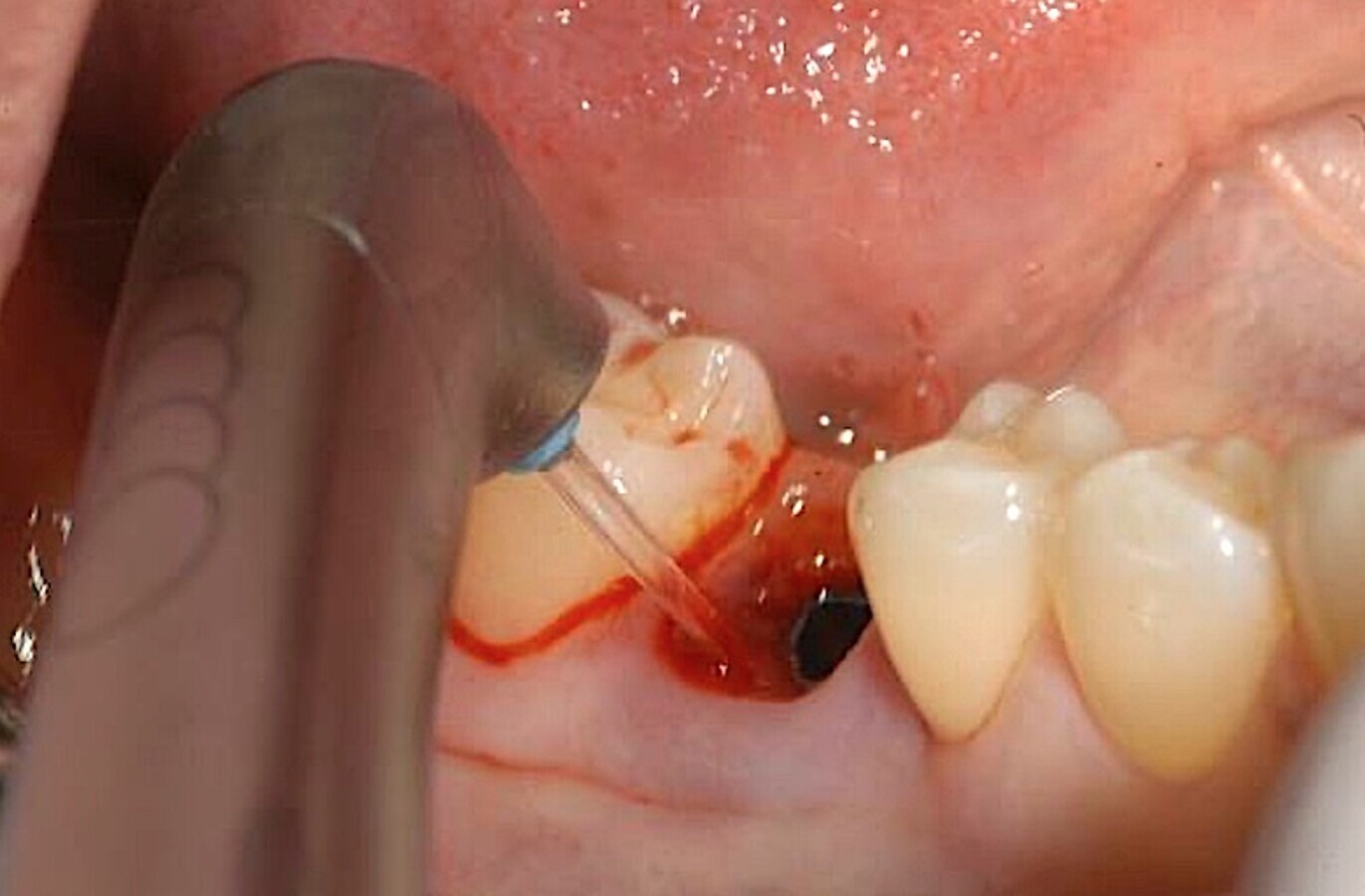 Figura 6. Tratamiento no quirúrgico utilizando láser de Er,Cr:YSGG para el tratamiento de la periimplantitis. 1.5W, 40% aire y 60% agua a 30 Hz.