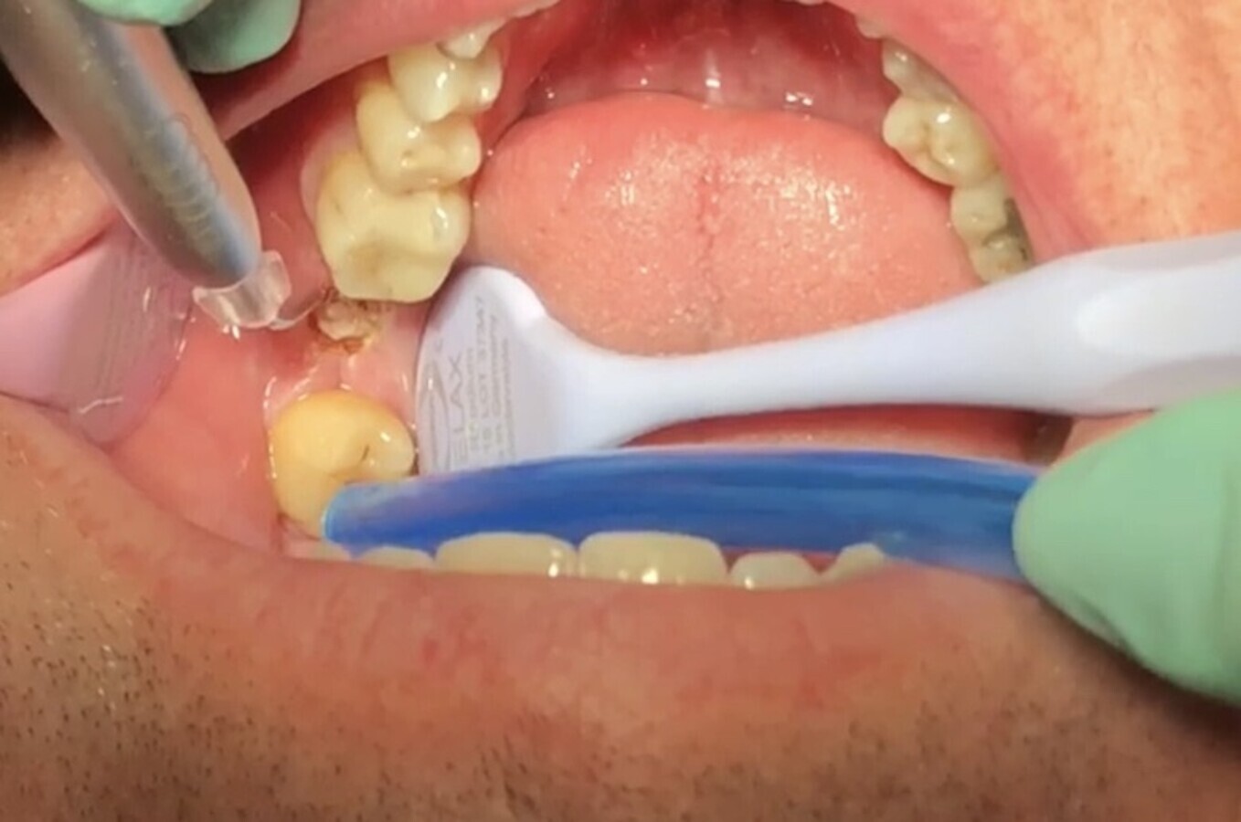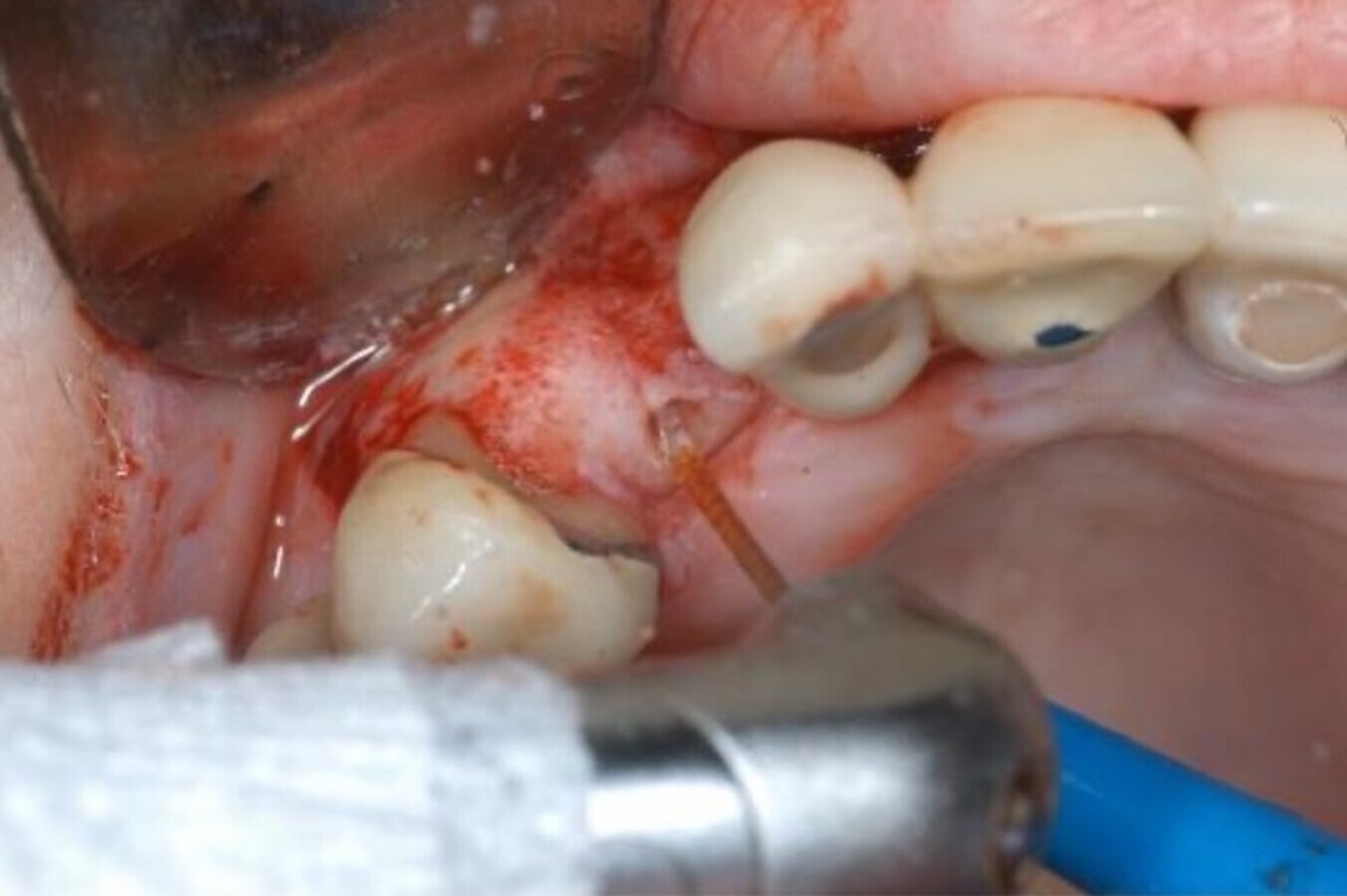 Figura 1. Desinfección alveolar con láser de diodo tras extracción para preservar alveolo. Técnica utilizada con láser de diodo 940 nm a 1W de potencia durante 60 segundos en modo continuo. Punta 400 micras.