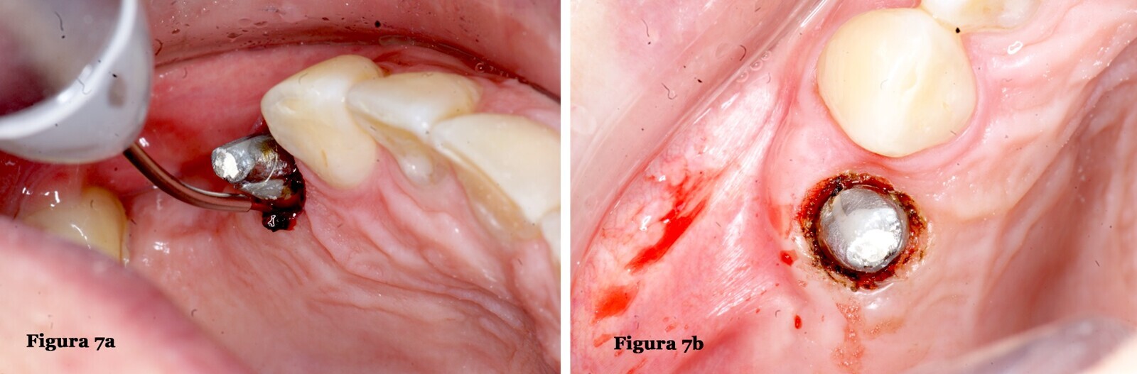 Figuras 7a - 7b. Separación gingival para coronas sobre implantes con un láser de diodo, en modo súper pulsado.