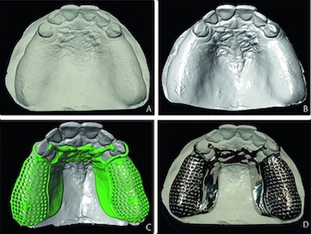 Figura 10. Imágenes que muestran 4 pasos en el flujo digital para la fabricación de una estructura de prótesis parcial removible: A) Modelo de yeso. B) Modelo digital a partir del escaneo. C) Diseño digital gracias al software. D) Estructura metálica producida mediante fresado o impresión 3D de sinterización selectiva por láser.