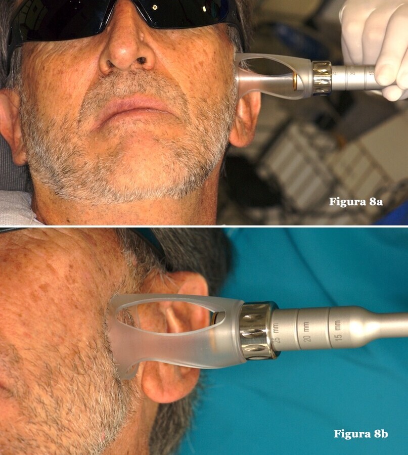 Generalmente se usan láseres de diodo cuya longitud de onda está entre los 600 y los 980 nm, es decir, en el espectro rojo e infrarrojo cercanos8,9. Son fácilmente tolerados y sus efectos pueden verse después de una a seis sesiones, en las que suelen usarse las puntas desfocalizadas según el fabricante, para aumentar el área de irradiación y disminuir la densidad de energía (Figura 8).