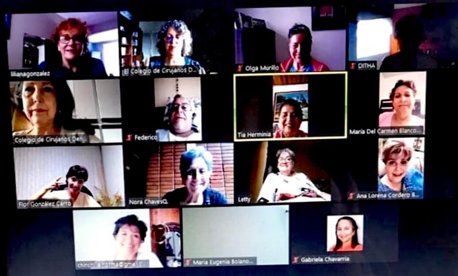 Participantes del Programa "60 y más” interactúan por medio Zoom, incluyendo a la expresidenta de CCDCR, Dra. Nora Chaves.