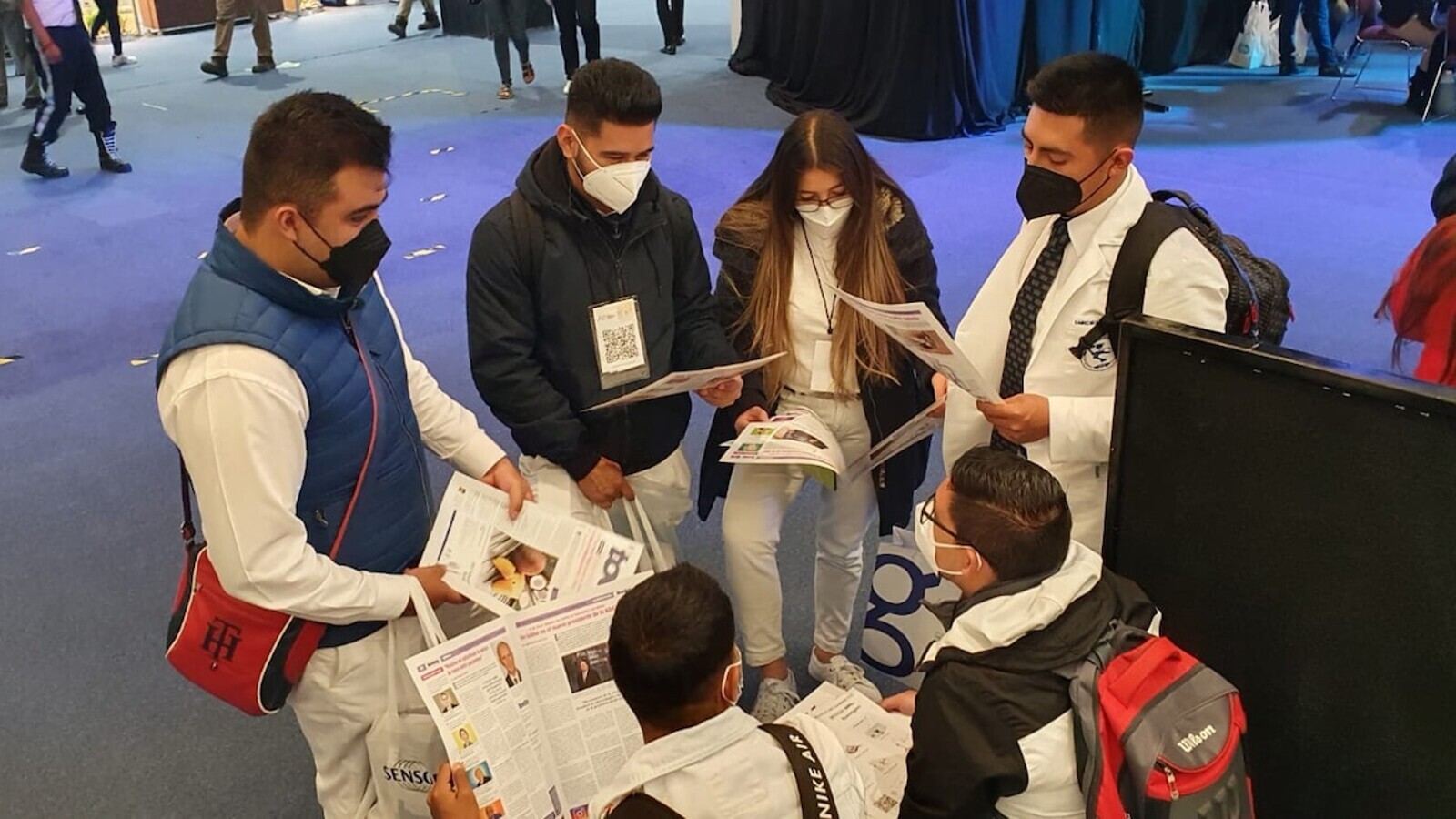Un grupo de estudiantes de odontología con el periódico de ferias de Dental Tribune.