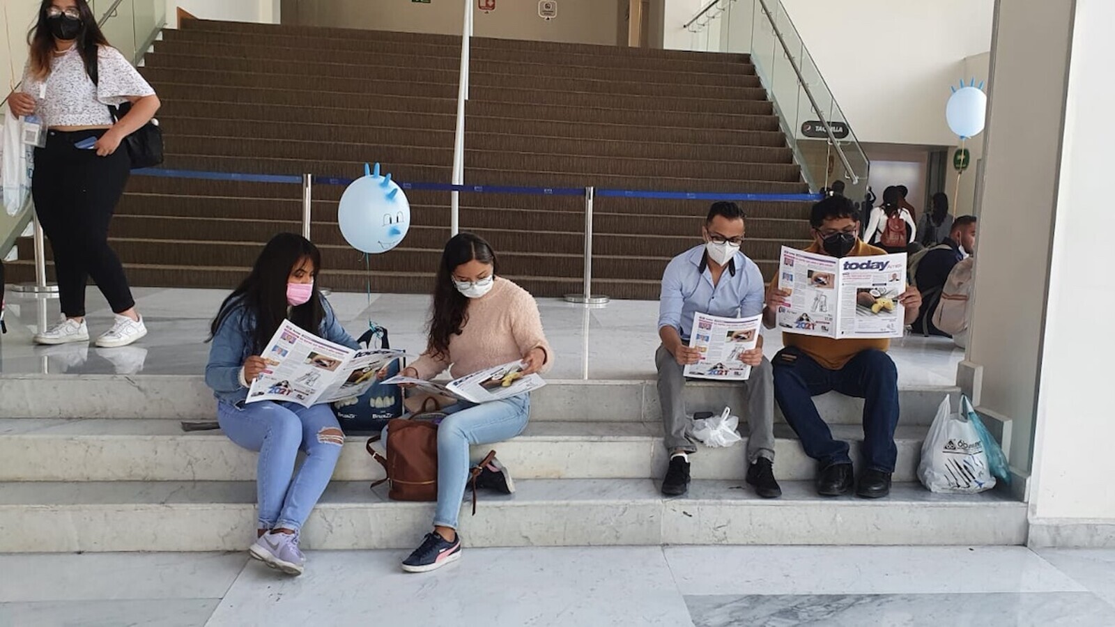 Un grupo de estudiantes muestran orgullosos sus ejemplares de “today”.