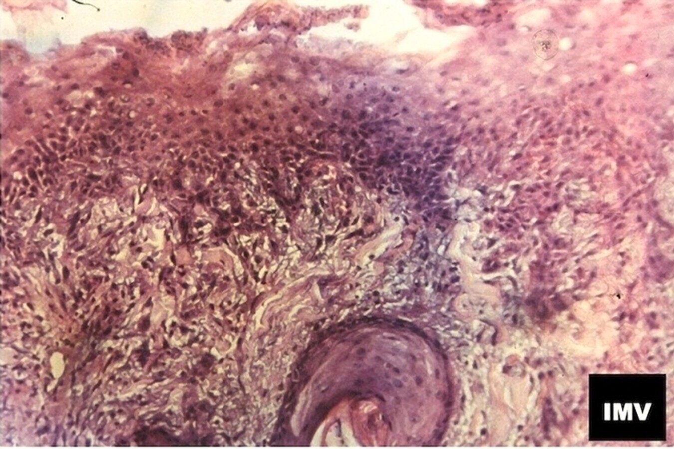 Figura 3. Muestra de piel x400 HE/EO, cinco días después del tratamiento de resurfacing con alta energía programada en el láser de CO2, para emisión en modo fraccional y con notable densidad de pulsos en el diseño seleccionado para el tratamiento. Se aprecian restos de dermis superficial con signos de coagulación y la imagen de un folículo piloso en la dermis profunda que “inyecta” activamente células con misión reparativa de la piel, una vez transcurrida la fase primera (inflamatoria) de reparación de una herida.