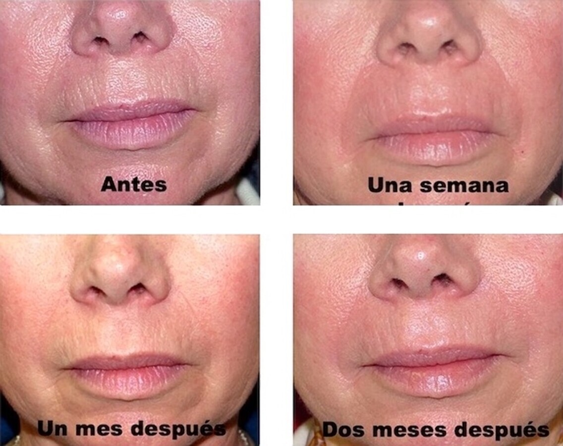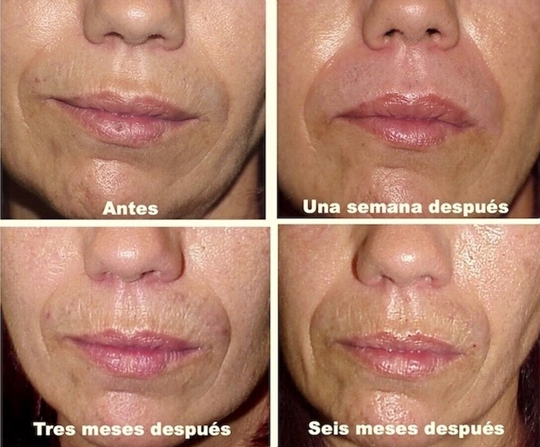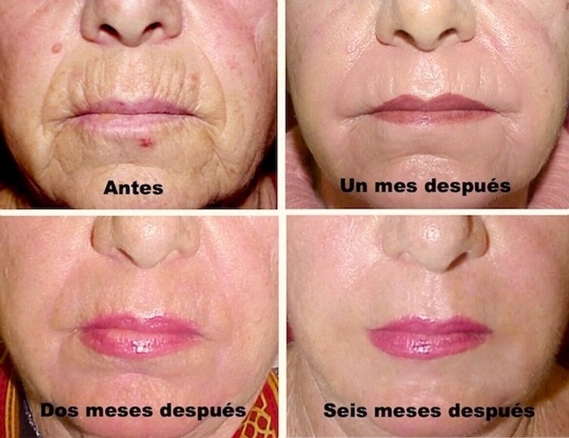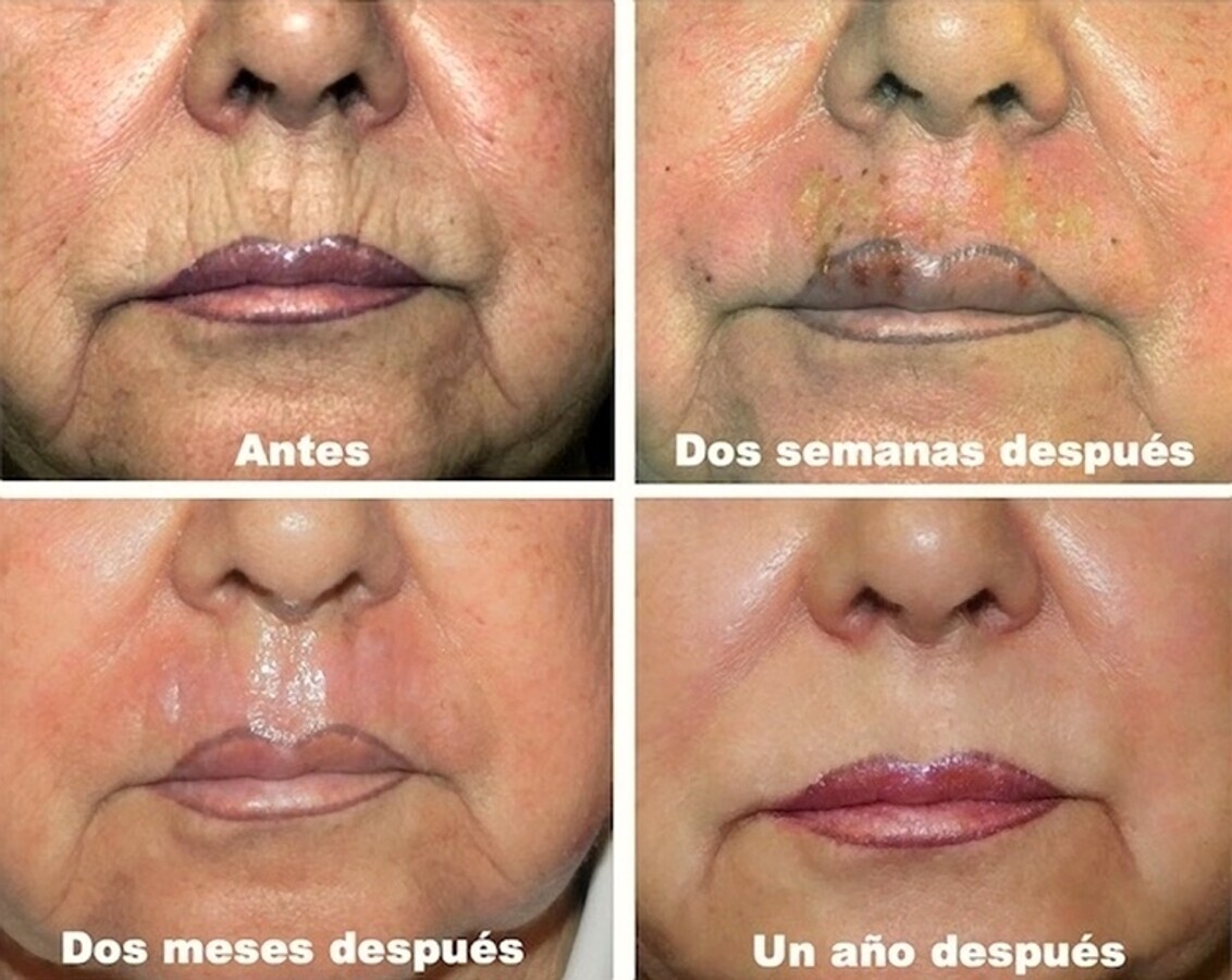 Figura 14. Evolución de resultados en el labio superior y en los pliegues de las comisuras tras resurfacing con láser de CO2 Un año después, la persistencia de efectos beneficiosos es buena.