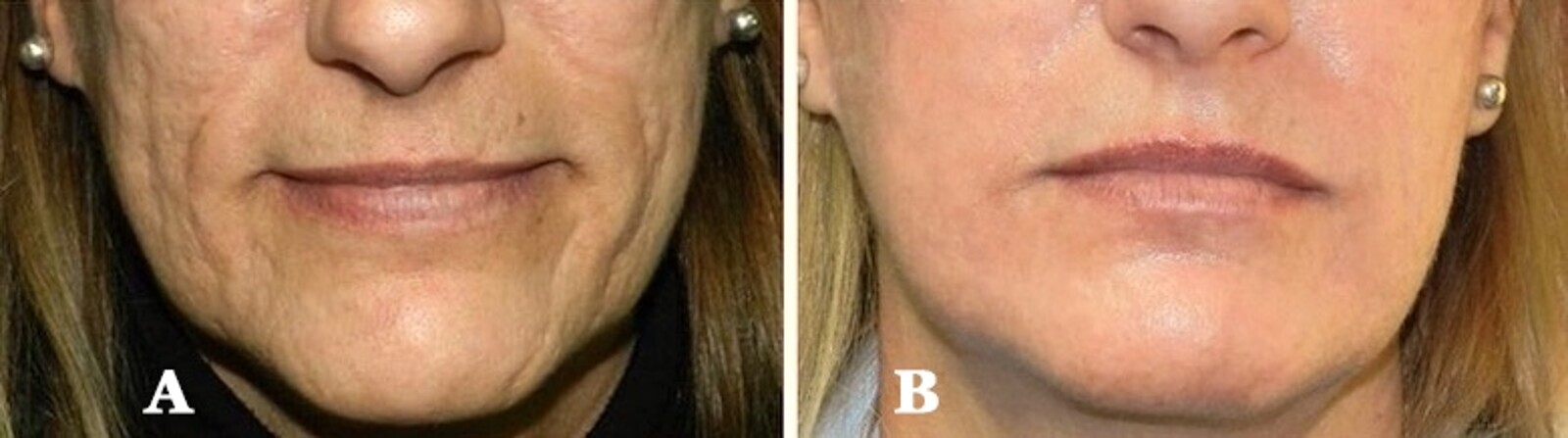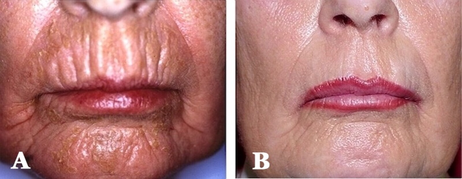 Figuras 10A-10B. Resurfacing con pulsos láser de CO2 de alta intensidad en modo secuencial de la totalidad de la cara, con un solo pase. Imagen inicial (A) y un mes después del tratamiento (B), que muestra los resultados obtenidos en la región peribucal. La mejoría es evidente tanto en la eliminación de las arrugas de varios grados como en los cambios en la calidad y textura de la piel, especialmente en la pigmentación cutánea.