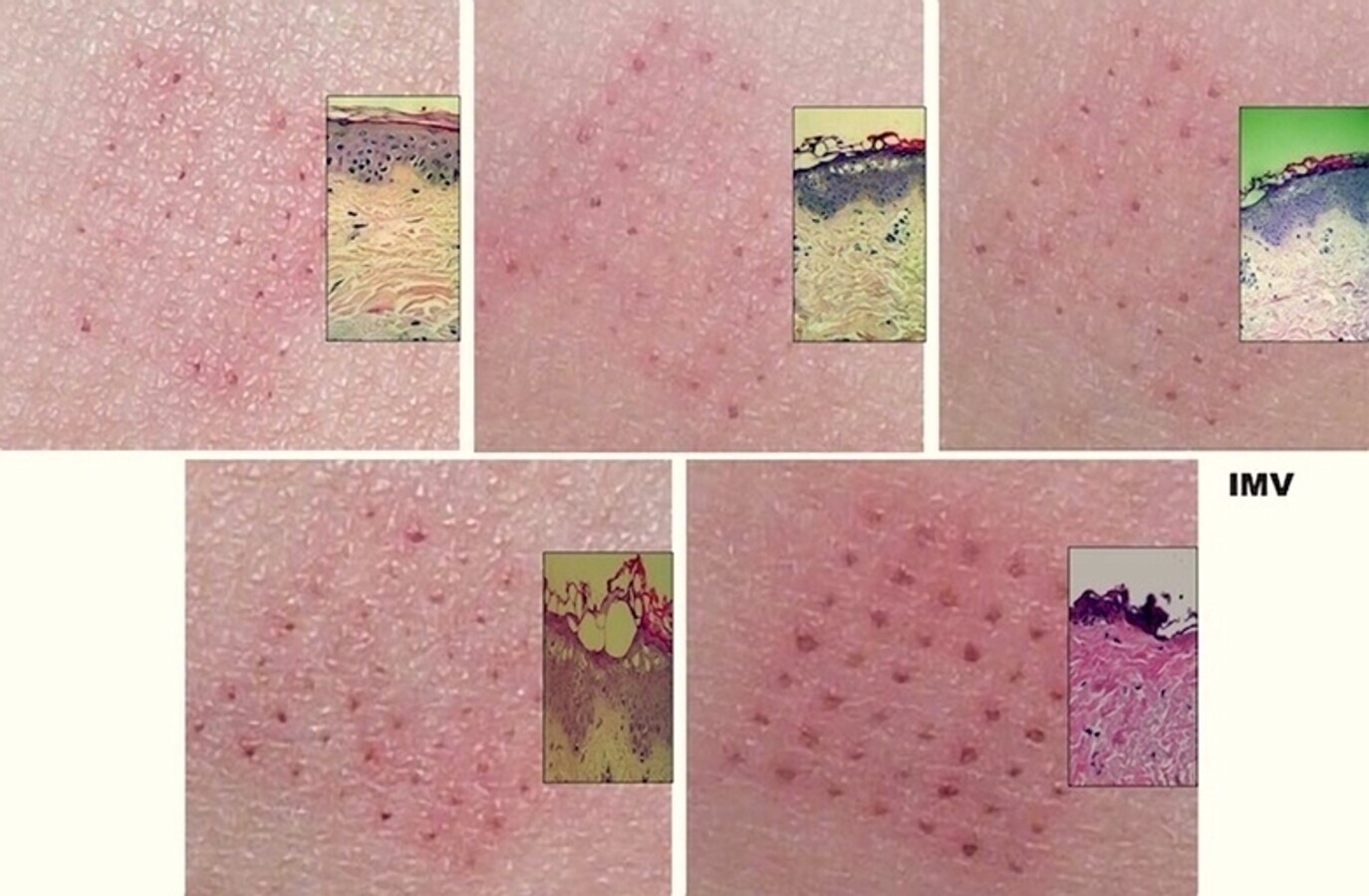 Figura 26. Aumento progresivo de los pulsos de láser. Efectos clínicos del resurfacing en modo Pixel. Se observa el punteado de progresiva cantidad. Según muestran las histologías, los varios pases de láser eliminan más tejido sin causar prácticamente daño térmico residual.