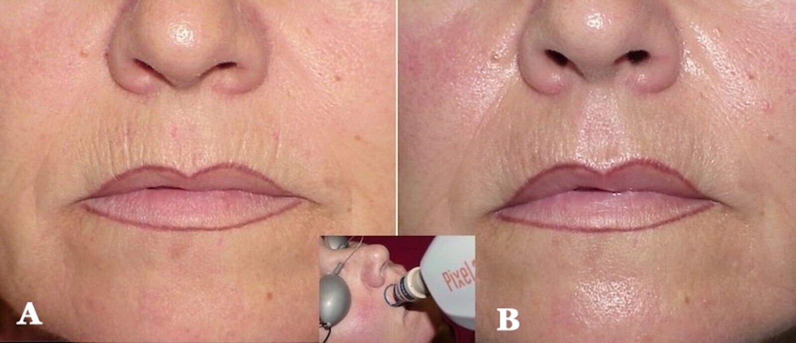 Figuras 28A-28B. Láser Pixel Er:YAG de Alma en modo “Stacking”. Antes (A) y 2 semanas después del tratamiento de resurfacing (B). Se realizaron seis disparos en el mismo sitio a fin de llegar a la dermis y crear un sólido efecto térmico sin provocar sangrado. En la imagen pequeña aparece el labio durante el tratamiento.