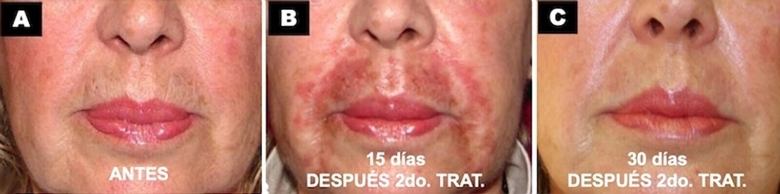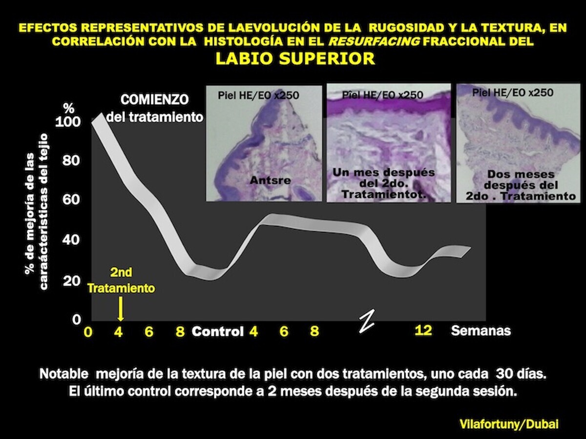 Figura 15. Evolución de la rugosidad y la textura en relación con la histología en el resurfacing fraccional del labio superior. Notable mejoría de la textura de la piel con dos tratamientos, uno cada 30 días. El último control corresponde a 2 meses después de la segunda sesión.