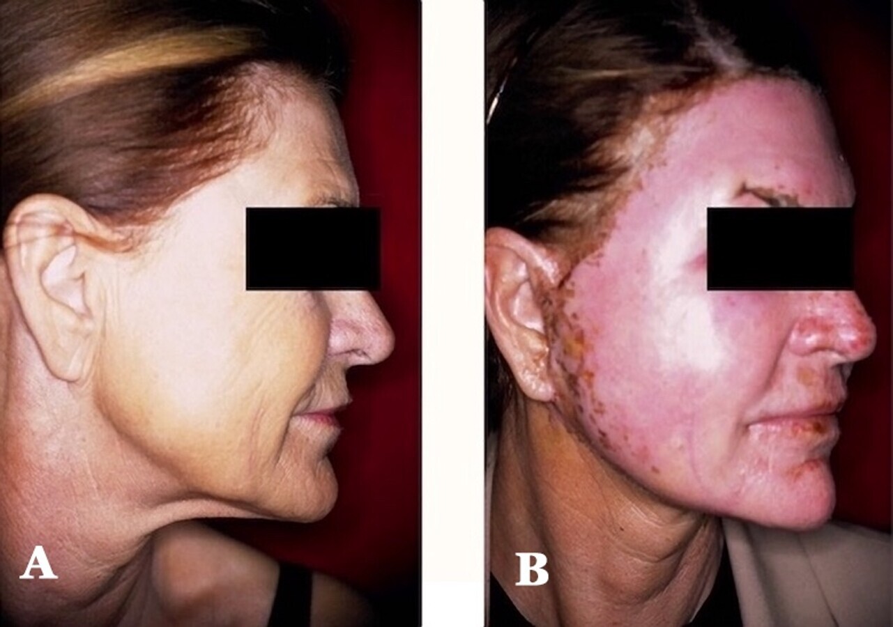 Figuras 9A-9B. Estado inicial (A) y combinación de cirugía en un solo tiempo de “lifting” del tercio inferior de la cara y cuello y resurfacing panfacial con láser de CO2 en modo convencional (B). Obsérvese la notable mejoría de la piel de la cara y laxitud del cuello (donde no se utilizó el láser), una semana después de las cirugías, cuando las costras han prácticamente caído en su totalidad. El eritema es intenso y se notan signos de edema, consecuencia del resurfacing.
