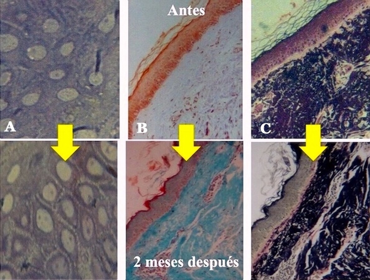 Figuras 7A-7C. Cortes histológicos finos que muestran el antes y después del resurfacing controlado a los 3 meses, donde: (A) la unión de células epidérmicas está bien cementada; (B) el colágeno es denso y notable bajo la unión dermo-epidermica y, (C) la elastina de ser grumosa y desordenada cambia a bandas anchas, todo ello indicativo de rejuvenecimiento de la piel tratada con láser.