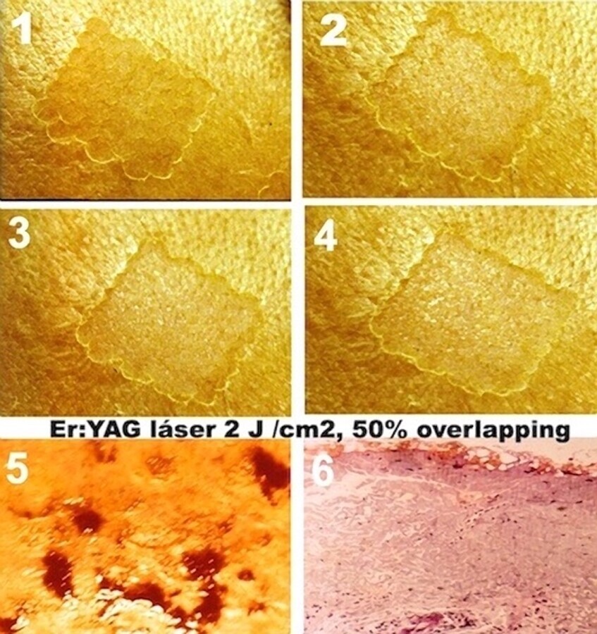 Figuras 16.1 - 16.6. Pases progresivos del láser de Er:YAG (imágenes 1-5) con programación usual en resurfacing. Al llegar a la dermis el sangrado impide seguir la eficaz eliminación de tejido (imagen 6). La histología no muestra coagulación residual.