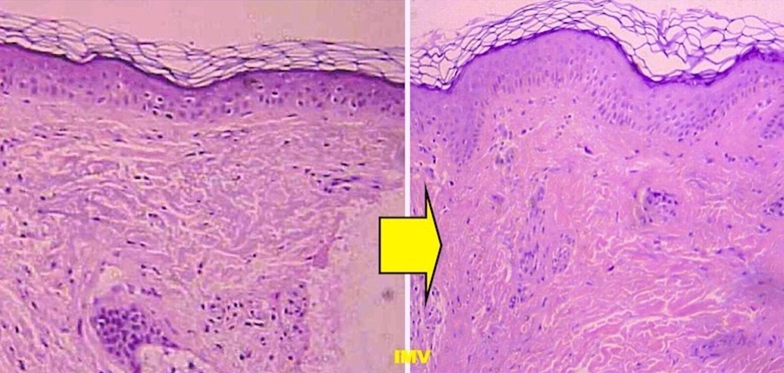 Figura 23. Rejuvenecimiento de la piel no ablativo. Histología de piel con tinción de HE/EO x250, antes y 3 meses después del tratamiento de resurfacing no ablativo. Obsérvese el cambio significativo del tejido, que muestra características propias de una piel más joven.