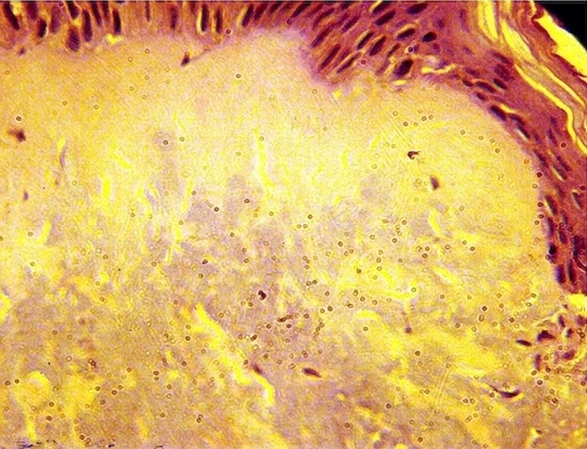 Figura 22. Tratamiento láser no ablativo. Histología de piel con tinción de HE/EO x250, inmediatamente después de un tratamiento láser no ablativo. La epidermis aparece conservada en tanto que la dermis no muestra su patrón normal: no se observan fibras y el tejido aparece coagulado por efecto de la acción térmica desarrollada a este nivel por absorción de la energía láser.