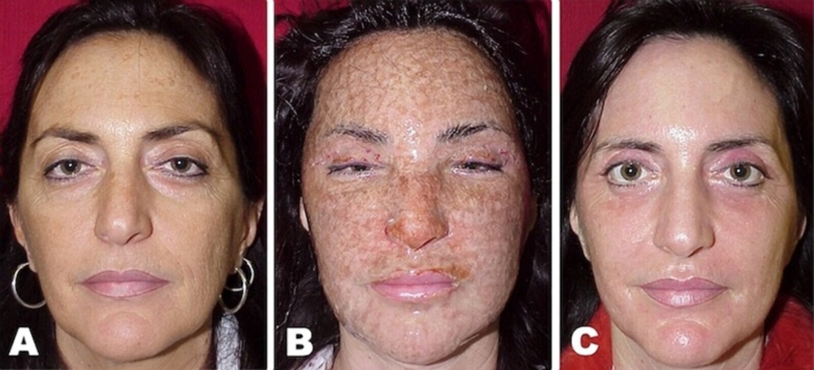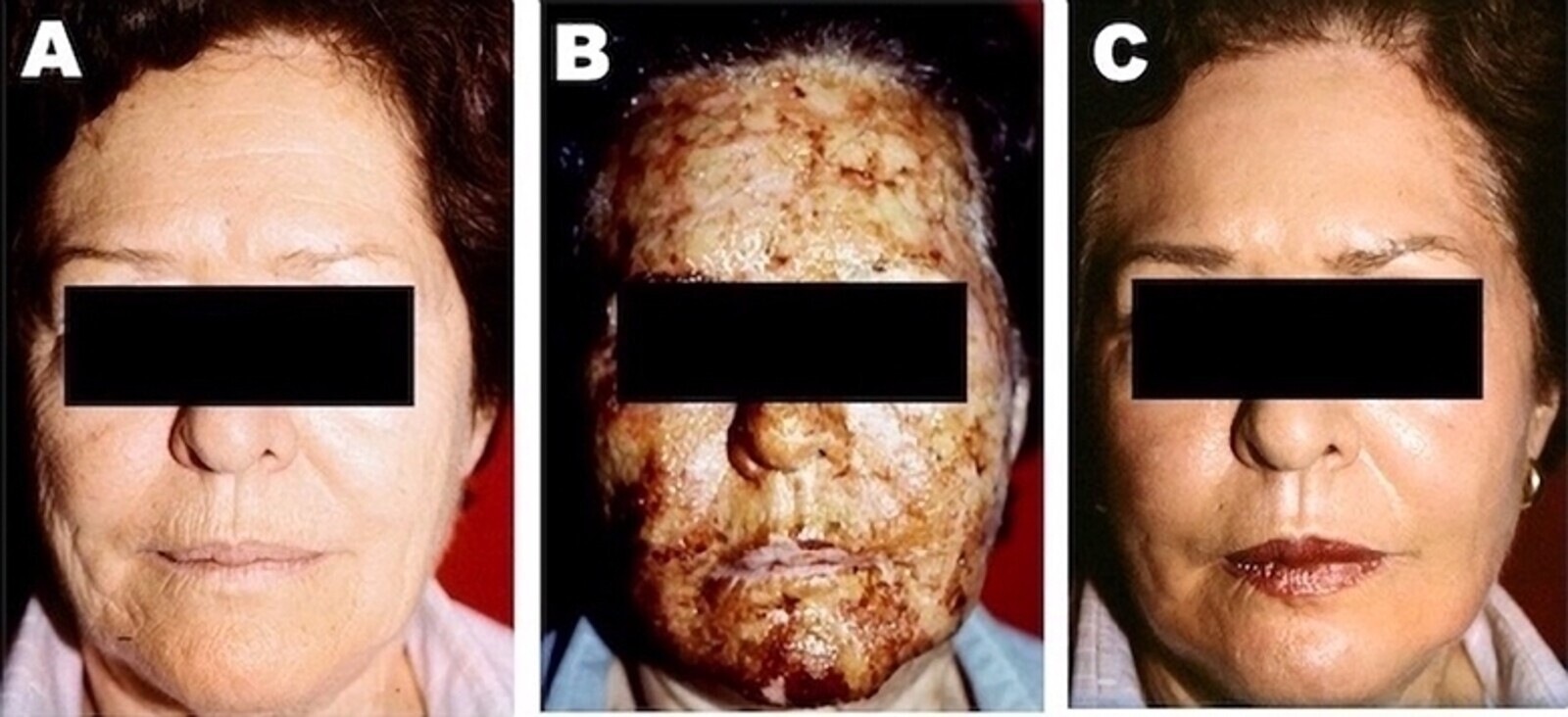 Figuras 1A-1C. Evolución estándar de un Resurfacing convencional con láser de CO2. (A) Condición antes del tratamiento. (B) Aspecto 5 días después. Nótese las notorias costras y edema que impiden a la paciente poder realizar sus ocupaciones normales de trabajo. En (C) se aprecia la significativa mejoría de la condición de la piel, en las arrugas y en la flacidez cutánea. Puede aún observarse el eritema residual que acompaña la piel hasta su total recuperación.