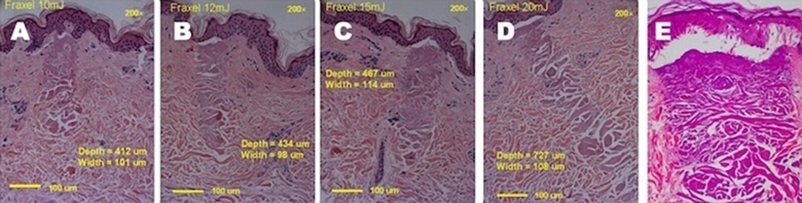 Figuras 24A-24E. Rejuvenecimiento fraccional no ablativo. El método del láser Fraxel (A, B, C, D) muestra los efectos en el interior de la piel al incrementar el ancho del pulso. Obsérvese la columna de coagulación en dermis que aumenta con el incremento de tiempo de actuación del pulso. Lo mismo ocurre con el láser no ablativo (E), en este caso de la firma Lutronic, donde un pulso más ancho de 30mJ permite la propagación de la energía hacia la superficie, consiguiendo desprender la epidermis. De ahí que se consigan afectos también en el exterior de la piel con este modo de tratamiento, que en principio no debiera, lesionar la epidermis.