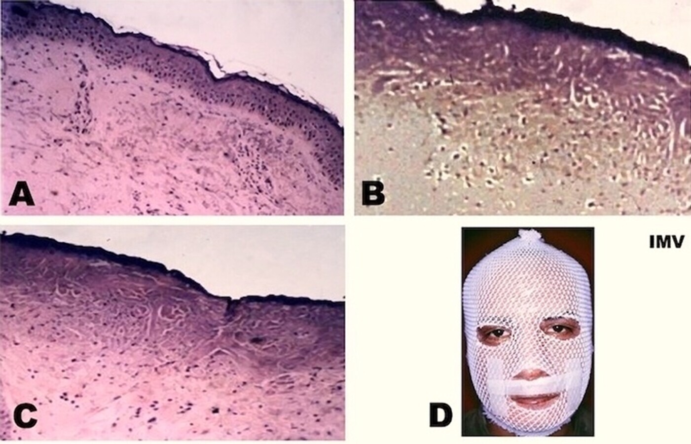 Figuras 2A-2D. Histología de piel con tinción de HE/EO x250. (A) Antes del tratamiento. (B) Aspecto 2 pases después del resurfacing con láser de CO2: vaporización de la epidermis y banda extensa de coagulación en dermis que se muestra claramente eosinofílica. (C) El tejido muestra desecación y amplia banda de coagulación que inflamará la piel y activará la formación de colágeno y elastina. (D) La paciente protegida para evitar la exposición de la piel.