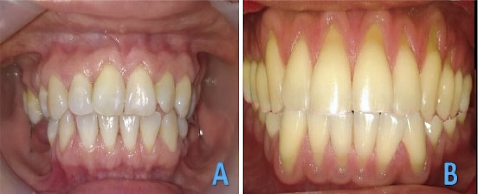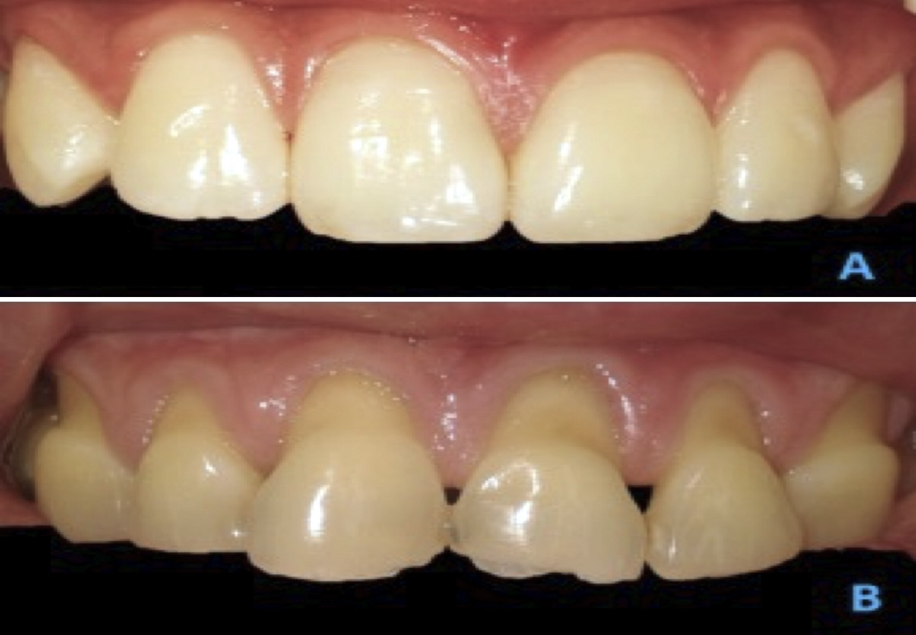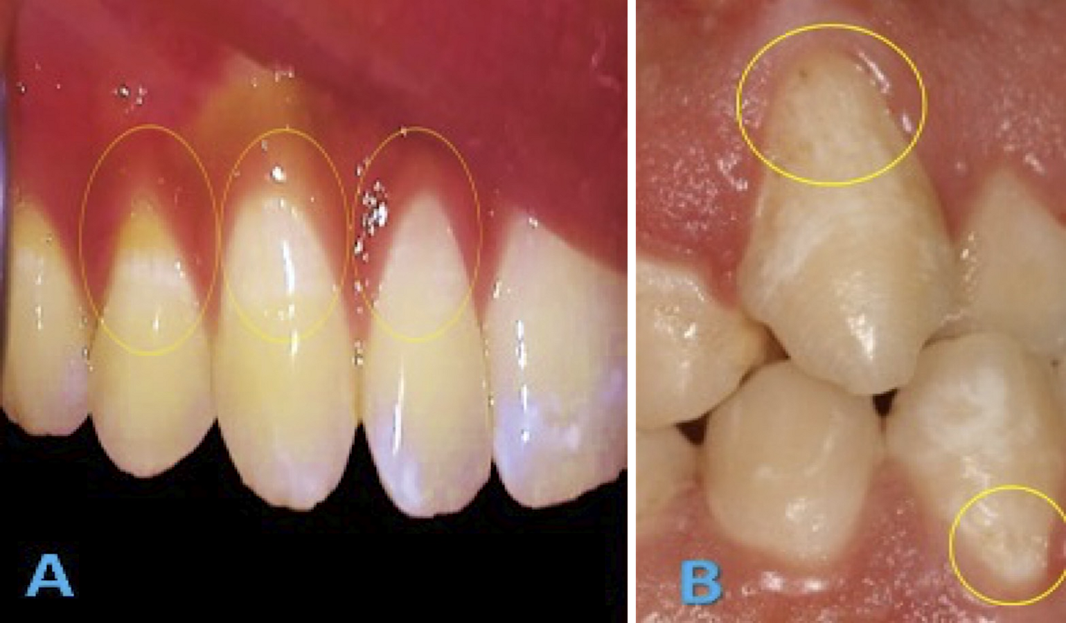 Figura 5. A) Paciente de 30 años con LCNC masivas (SPNC). B) Paciente de 32 años con serie de dramáticas recesiones vestibulares. Ambos reportan bruxópatia y dieta acida.