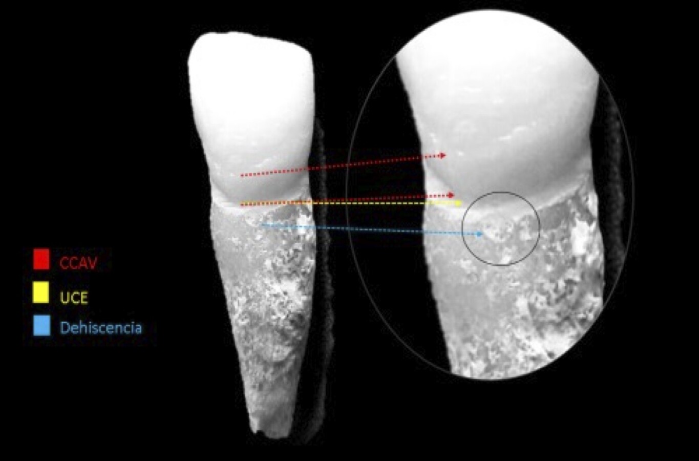Figura 3. Delimitación del cinturón cervical adamantino vestibular (rojo). Unión esmalte-cemento (amarillo). Rasgos sulculares en diente anterior, líneas incrementales formulando dehisencia (azul)