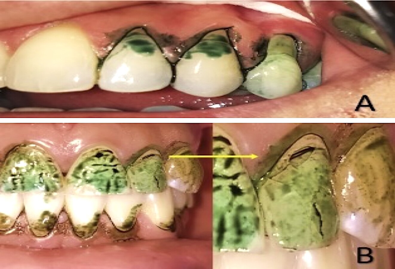 Figura Figura 7. A) Paciente de 28 años con tipología diversa en un solo sector: erosión, fisura de Stillman y abfracción, B) Hipoplasia y fractura de cinturón amelo vestibular, reporte de bruxopatia. Decantamiento con prolongación hacia tercio incisal. Detección con señalador de caries.