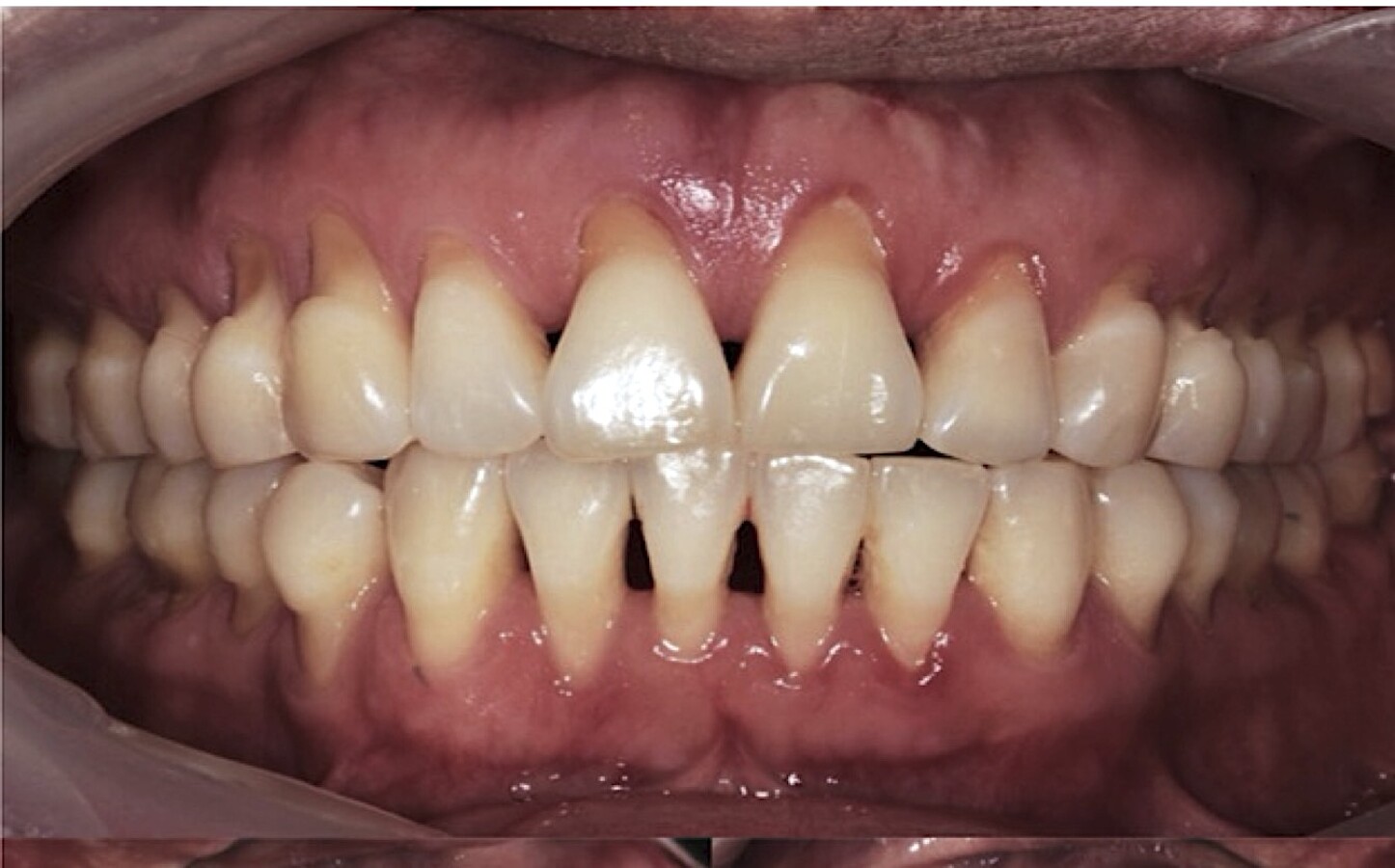 Figura 6. Paciente de 45 años. Reportó tratamiento ortodóncico de 4 años, tratamiento de ácido alendrónico, bruxópatia y, dieta matinal acida. Se observa afectación masiva de LCNC/SPNC.
