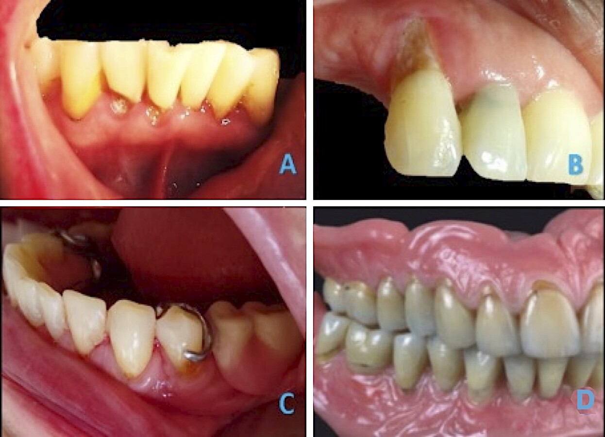 Figura 9 A) Paciente de 55 años con caries en tercio cervical de dientes anteriores en mandíbula B) Caries radicular promovida por soportación protésica. C) Recesiones y desajuste de retenedores de prótesis removible. D) Prostodoncia total con caracterización de LCNC.