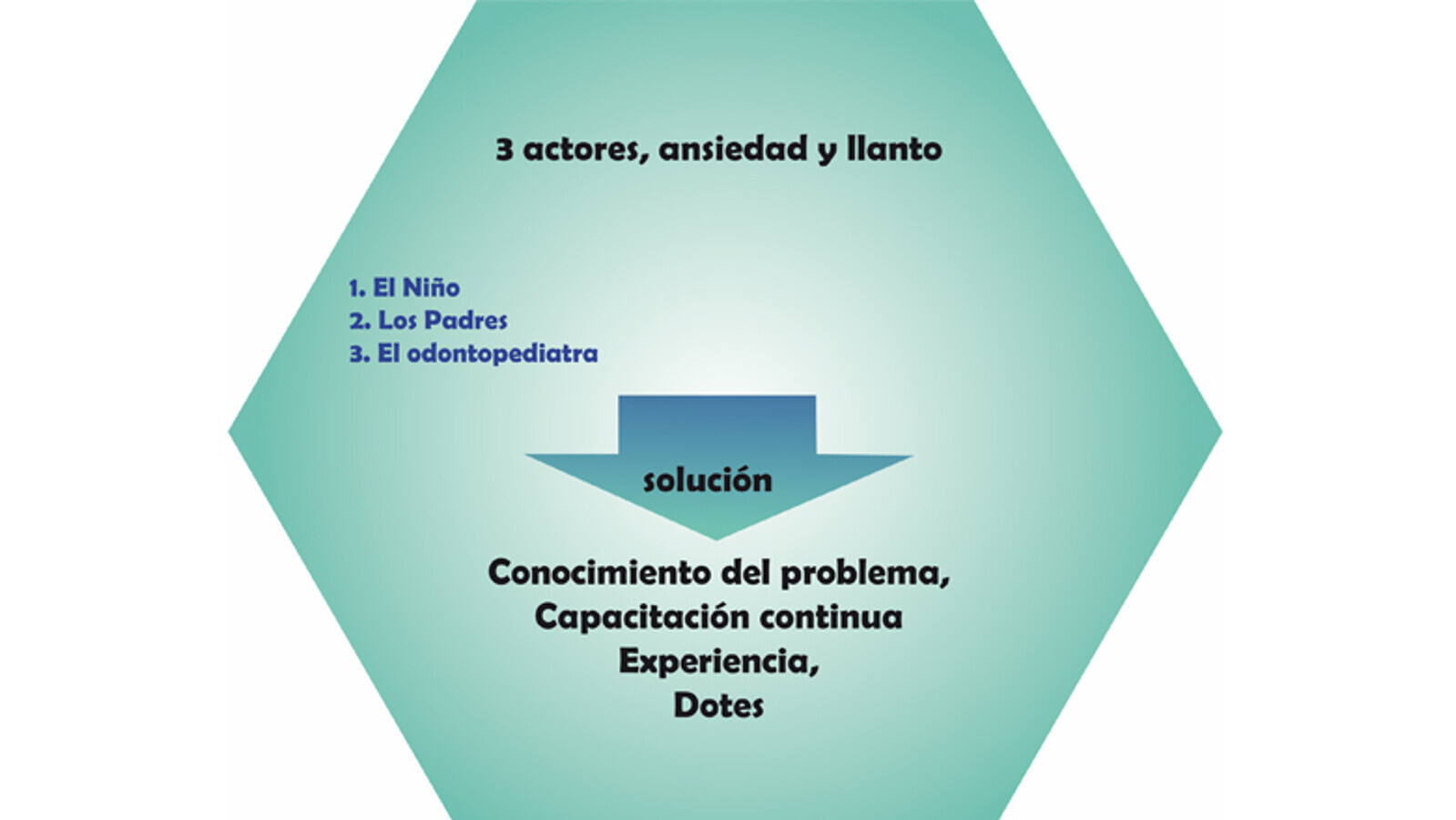 Existen 3 actores o grupos de actores dentro de un “escenario de trauma dentario” en un niño pequeño: el paciente, los padres y el odontopediatra/personal auxiliar. El primero y los segundos actores llegan a la consulta envueltos por llanto y ansiedad. El tercer actor no puede darse ese lujo. Por ello, lograr el dominio del escenario y el control de la situación, traducida en disminución del llanto y ansiedad, tanto en los padres como en el bebé, es responsabilidad del equipo del consultorio. Esto dependerá de su conocimiento del problema (estudio), capacitación continua (actualización), experiencia (casos atendidos), y dotes personales (personalidad y profesionalización) (Figura 2).