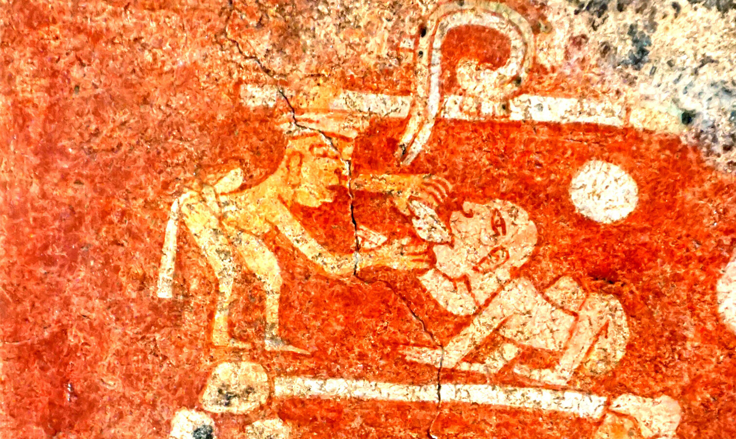Foto: Holger Goetzendorff, 2017 Un análisis realizado por los autores indica que esta imagen del mural de Tepantitla en Teotihuacán, México, no representa un procedimiento dental, como se creía desde hace mucho tiempo.