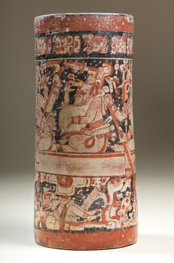 Colección Museo Popol Vuh, Universidad Francisco Marroquín. Foto: Jorge Pérez de Lara. Vaso maya que muestra una imagen mitológica del viaje del Dios del Maíz en una canoa al inframundo, donde renace cíclicamente, como el maíz, de las fauces de una serpiente acuática.