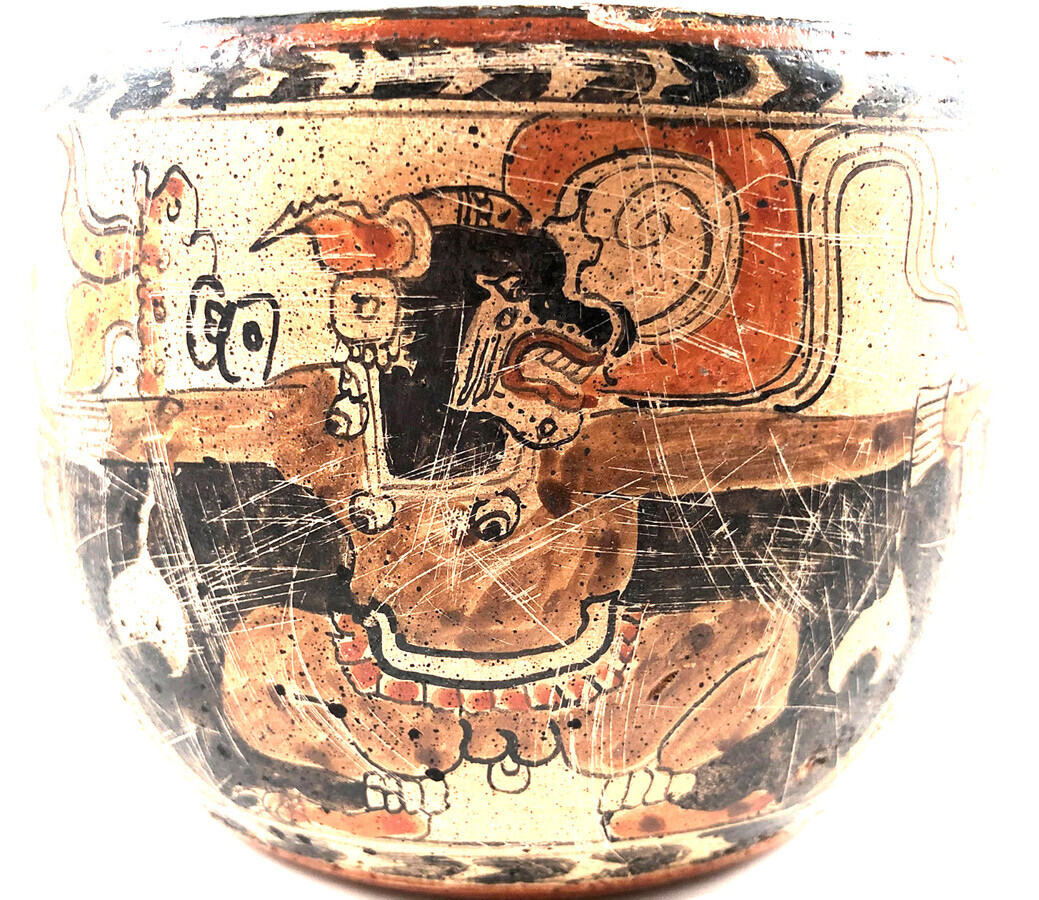 Colección privada. Derechos reservados. Vasija de barro maya que muestra a un individuo con máscara de murciélago, probablemente perteneciente a la Dinastía del murciélago, hallada en Guatemala.