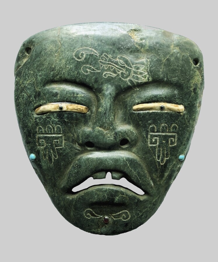 Colección privada. Derechos reservados. Las incrustaciones de piedras semipreciosas y grabados que se aprecian en esta máscara Olmeca de jade de 3000 años de antigüedad son un elocuente ejemplo de los adornos a los que se hace referencia en el libro "Rostros y dientes, decoraciones dentales en la antigüedad".