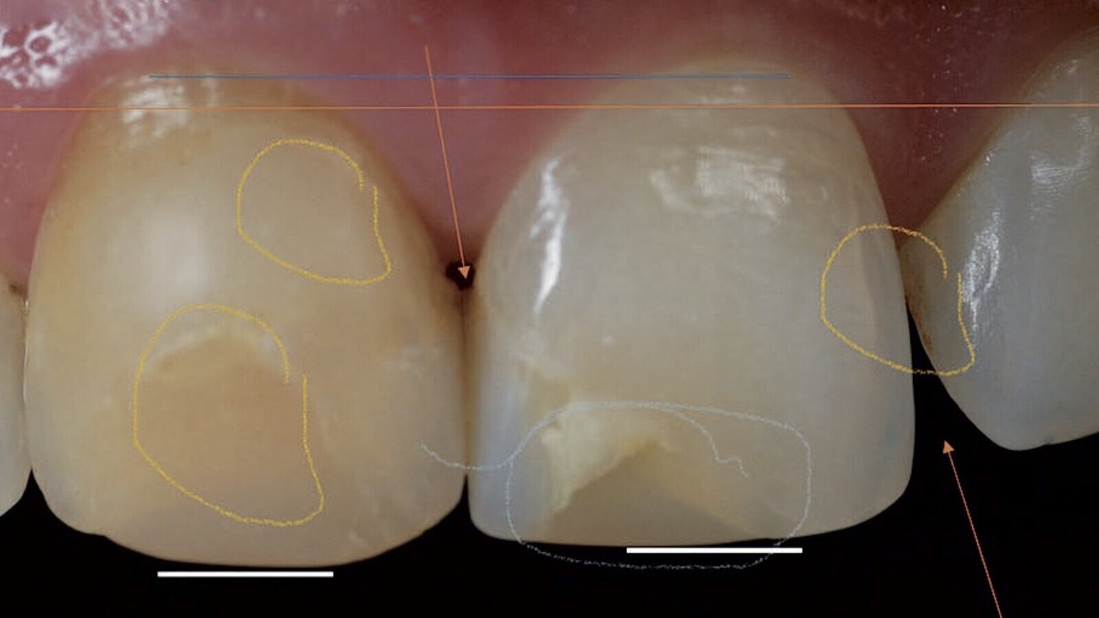 Figura 1. Caso clínico de un paciente joven con el primer bloque de atención terminado con serias anomalías de color en los incisivos centrales por traumatismos antiguos.
