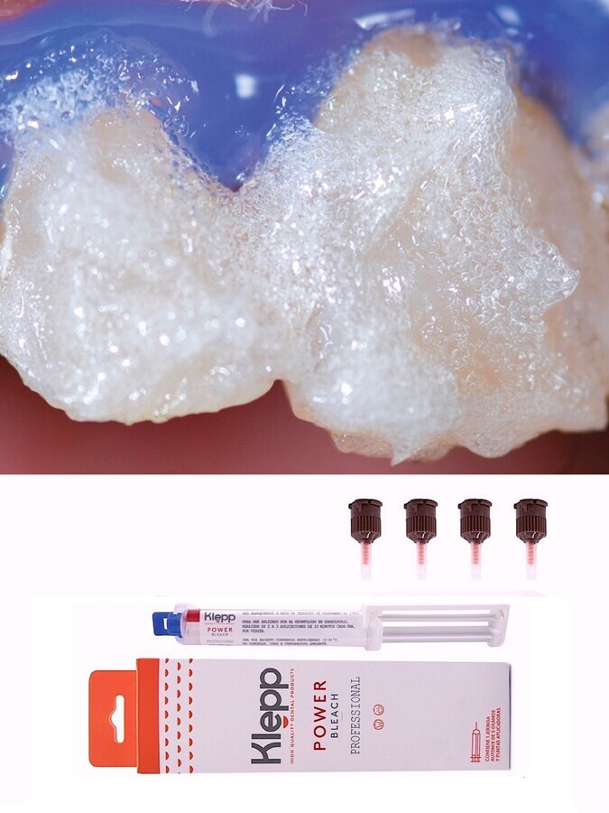 El peróxido de hidrógeno es el agente activo en el blanqueamiento dental, produciendo un proceso de oxidación. Nótense las burbujas de oxígeno liberadas por los productos de peróxido de hidrógeno al 35% una vez activados.