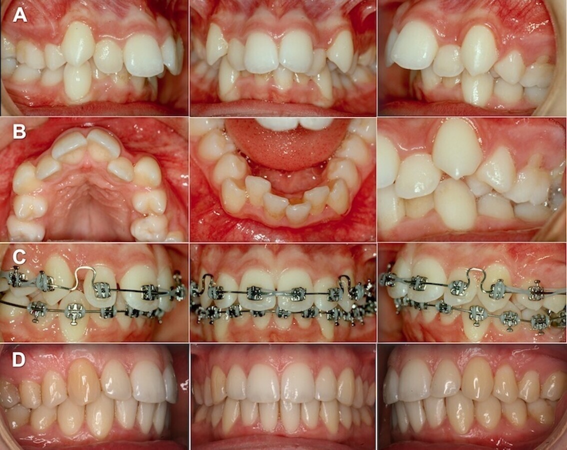 Figura 3. Tratamiento de una Clase II de origen mandibular y severa discrepancia óseo-dentaria con la Técnica SWLF (A-C); estabilidad funcional y estética tras 15 años fuera de retención (D).