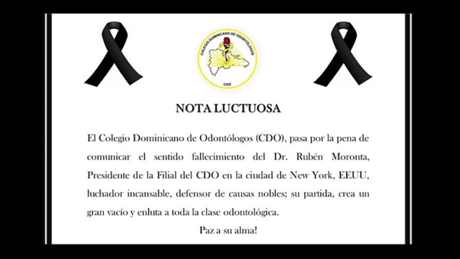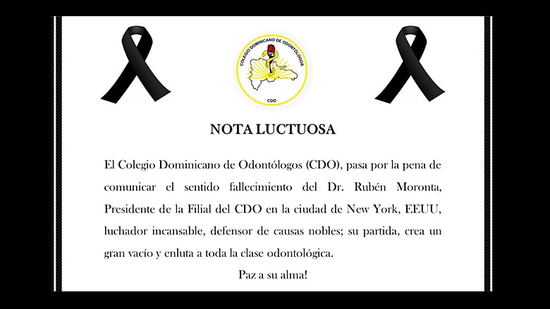 Informamos a toda la familia odontológica mundial que falleció en la ciudad de Nueva York el Dr. Rubén Moronta que, al momento de su deceso era el presidente del Colegio Odontológico Dominicano, filial USA.