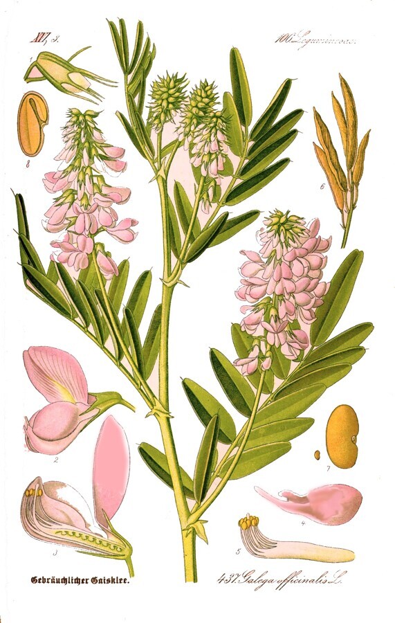 Galega(Galega officinalis). De uso antiguo, clasificada por el botánico sueco Carl Linneo. Dio origen a las biguanidas, sustancias que regulan la producción de glucosa en el hígado, y es el principio activo de la metformina.