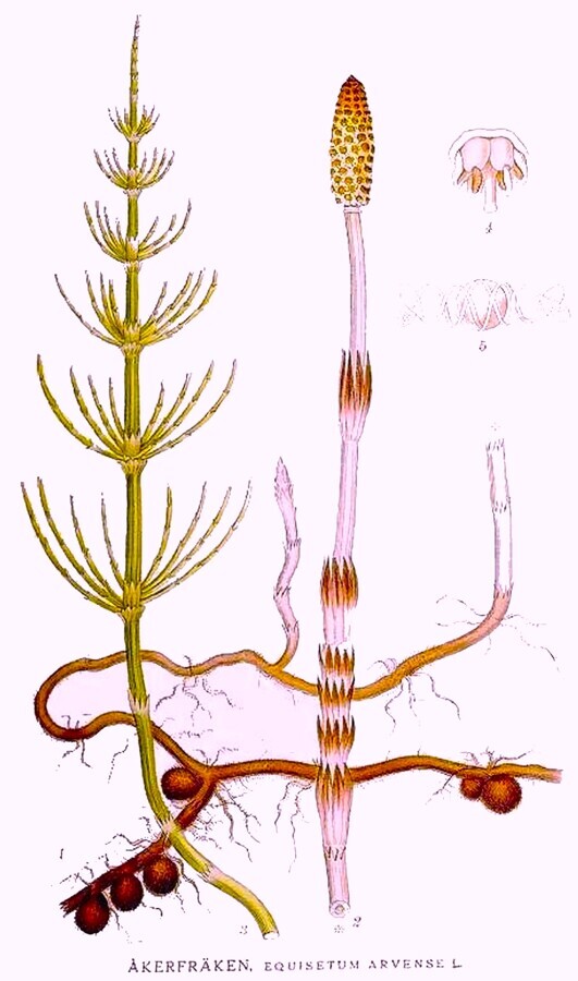 Cola de caballo(Equisetum arvense). Contiene flavonoides y sales minerales (manganeso y silicio, efectivo contra la osteoporosis). Elimina toxinas. Aumenta las defensas. Es antidiarreico. Favorece el mantenimiento del colágeno. Su uso prolongado produce debilidad muscular (no usar más de 6 semanas).